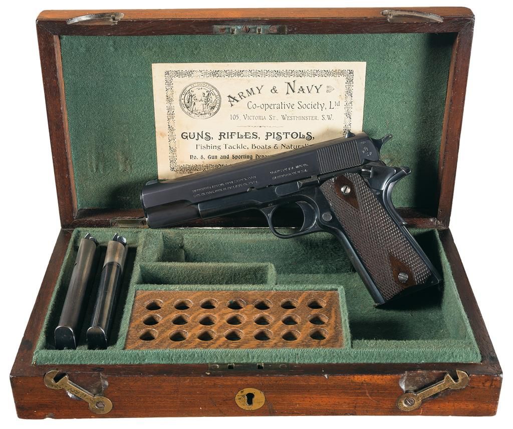 Extremely fine as partially refurbished with 98% of the original Colt blue finish on the frame and all the various components with the slide showing 98% of an old retailer applied dipped blue finish. The markings and proofs are clear and sharp. The walnut grips are near fine with nice distinct checkering, showing light wear across the tops of the checkering on the right side grip. The presentation case is also excellent with the silver presentation plaque still correctly fitted to the lid showing light wear and age overall. The outside of the case is also near excellent with a nice original dark brown exterior finish showing minor scratches and handling marks with the hinges, locks and front latches, still intact with tight corners and all the green felt being intact inside, including the full makers label inside the lid. A very rare and certainly historic WWI British Colt Model 1911 pistol.