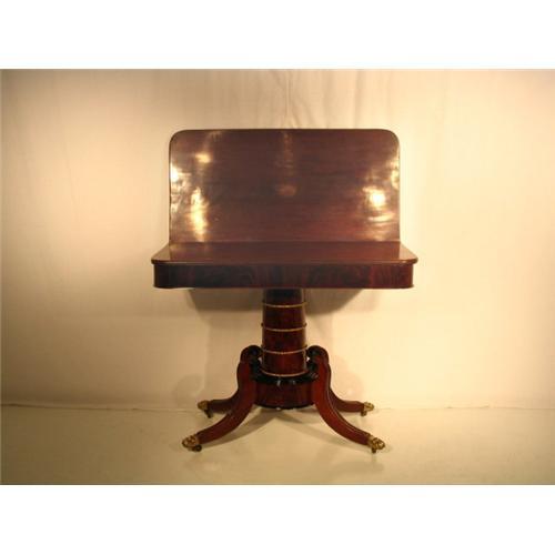 Classical Mahogany Game Table - perhaps south shore of Boston (Quincy or Weymouth Ma.) Certainly a wonderful example of a classical table from the Boston market circa 1820. This Classical Ormolu-Mounted and Part-Ebonized game table is constructed of mahogany with mahogany veneers. Having folded top with molded edge on cockbeaded conforming table resting on a circular veneered pedestal with die-stamped gilt brass lead-filled mounts all on a platform and four molded scrolled legs ending in brass hairy-paw feet on original casters. Although it apears to have a restored finish, this table is absolutely structurally unaltered and in a wonderful state of preservation. The base of this table is a statement in and of itself. There exists a slight taper to the top of each leg that shows the attention to detail of this cabinet maker. A rare find! Measures 37 wide by 29 high by 24 deep.