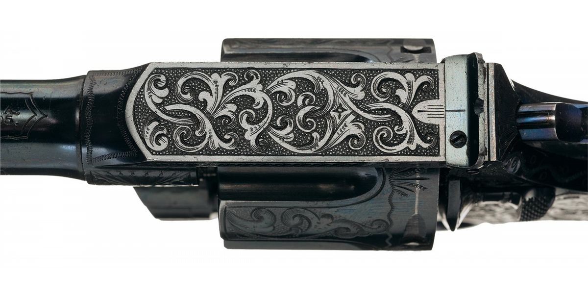 This is a spectacular example of a very early Colt Officers Model DA Target revolver that was manufactured in late 1909 which has been beautifully engraved in a Cuno Helfricht pattern and fitted with a set of Mother of Pearl Grips with large Gold initial inlayed in the right grip. If you could afford to own one of these early Colt Officers Model target revolvers that was a true mark of superior marksman and to have one that was factory engraved was usually only reserved for the very rich and/or elite top shooters in the shooting fraternity. These were beautifully manufactured revolvers that were hand built to exacting accuracy requirements and were the best target pistol at this time. They had flat top target type frames, adjustable front and rear sights, checkered trigger and back strap with a super smooth, hand honed, double and single action trigger pull. This exceptional pistol has also been beautifully engraved in a magnificent Cuno Helfricht pattern that covers over 75% (C coverage) of the metal surfaces. The Helfricht family was actively engraving from approximately 1870-1920, with this example falling right in the middle of those dates. The pattern consists of a beautiful laid out scroll engraving intermixed with several geometric patterns. The scroll engraving has a heavy punch-dot background covering the flats of the frame, sides of the barrel with an alternating pattern on the flutes of the cylinder, with geometric engraving on the borders, around some of the factory markings, sides of the top strap, front edges of the frame and cylinder crane and radiuses on both sides of the hammer. The grips as noted are Mother of Pearl and have the gold wire inlayed intertwined "JJR" initials on the right side. Even the top flats of the initials have been embellished with a punch-dot surface on the "R" and a cross-hatched pattern on the "JJ to give them a contrasting appearance. The metal surfaces have the original Colt high polish blue finish with the Colt niter blue on the trigger, rear sight, frame screw heads, and top surfaces of the hammer. The accompanying factory letter verifies the caliber, barrel length, blur finish, factory engraving, pearl grips with "JJR" inlaid in gold on the right panel and that it was shipped as 1 to Morrell Hardware (no address available) on April 15, 1910. A wonderful example of a Master level gun engraver from the 1910 era.