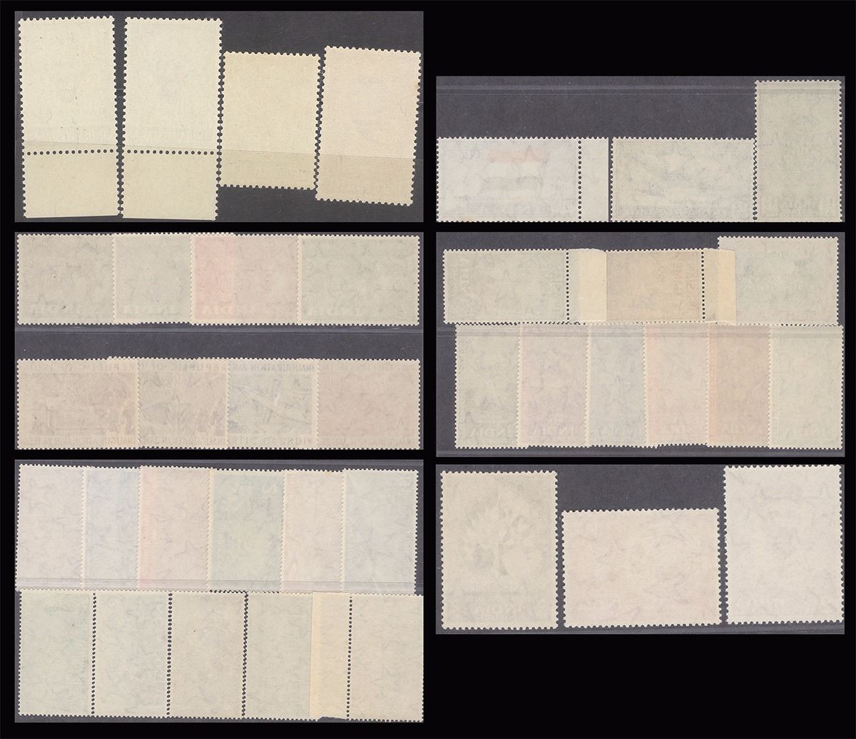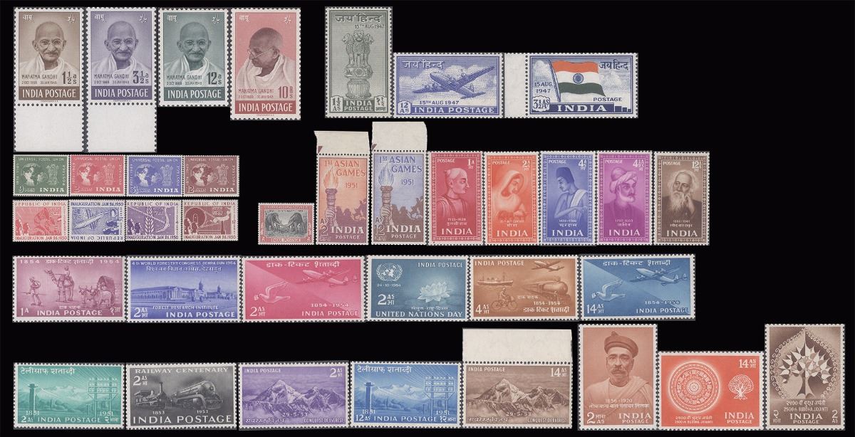 1947-1956, Anna Series,Complete Sets,Along With Independence,inauguration of India,Gandhi,UPU, Republic of INDIA, Geological Survey of INDIA, Indian Saints and Poets, Locomotive, Mount Everest, Telegraph, Postage Stamps Centenary, UN Day, Buddha Jayanti Tilak,MNH, White GUM, Supper Condition, Gandhi 1 1/2 3 1/2 Stamps with bottom Margin,Phila # 282 to 320,Extremely Rare.