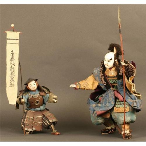 Extremely Rare 18th Century Edo Period (circa 1780) Musha Ningyô (Japanese Boys Day Figures) representing the famed brave warrior, Kato Kiyomasa (1562-1611), who accompanied Hideyoshi on his campaign against Korea. He is gloriously represented here, along with his attendant holding a banner of a Buddhist prayer, in this spectacular Ningyô. Kato is wearing sumptuous brocades, a black velvet trim robe with gold trim and is holding a spear with a sword at his side. He is seated on a military camp stool. Large Figure: 14 inches (35.5 cm); Small Figure: 9.5 inches (24 cm), Banner 18 inches (46 cm). From a widely renowned and published collection that has been exhibited at the Metropolitan Museum and Japan Society.