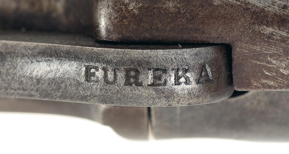 Covered by patent #16575 (Brettel & Frisbie, 10 Feb 1857), less than six of these revolvers are known to collectors today (see, for example, Seller and Smith's "American Percussion Revolvers", page 19). The patent covered an improvement to the Ells revolver, consisting of the addition of a "hesitation lock"- a mechanism in which the first pull of the trigger cocks the hammer and a further pull releases it. The revolver could also be fired by pulling the trigger straight through, ignoring the "hesitation". Marked "BRETTELL. & FRISBIE. / PATENTED FEB. 10. 1857." on left side of the hammer, "BRETTELL. / & / W. B. POTTS / COL. O" on right side and "EUREKA" on top. W.B Potts refers to William Potts of Columbus, Ohio, who was the son of a hardware dealer and was listed in the 1861-1862 City Directories as operating a brass foundry. Five shot cylinder, with iron frame and smooth grips. "53" is marked on the back of both grips, the bottom barrel flat and cylinder pin.