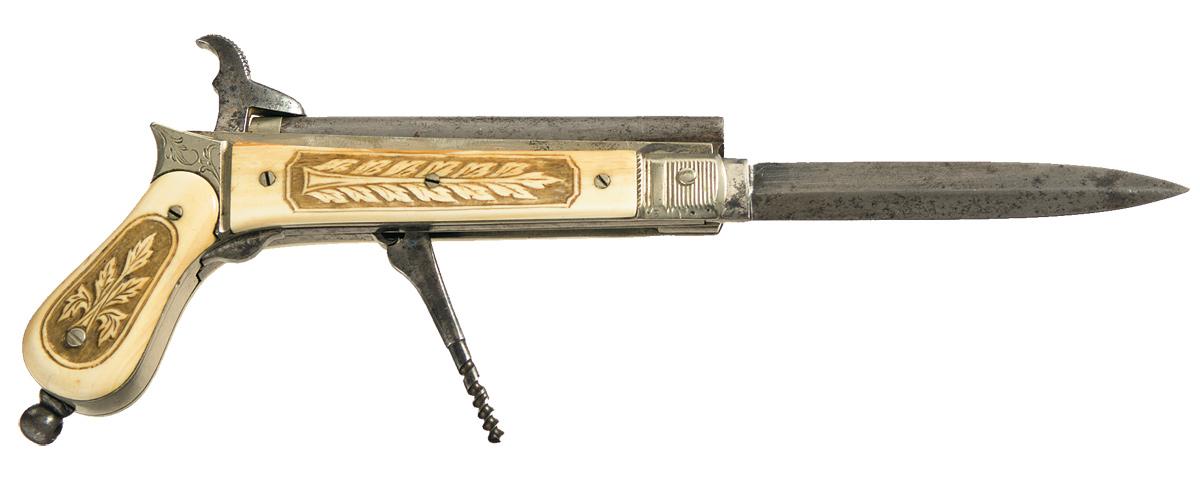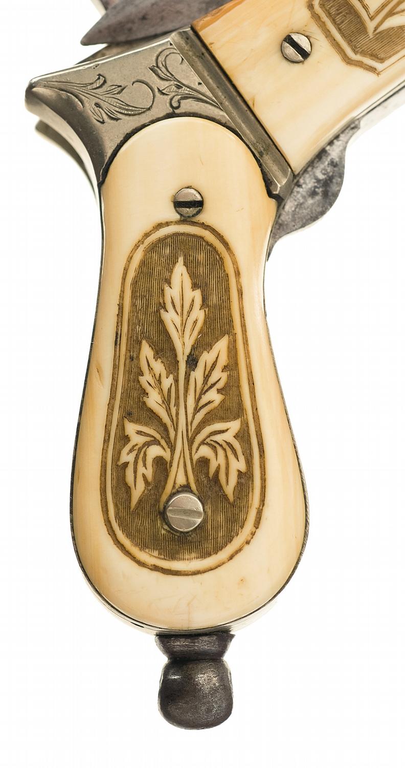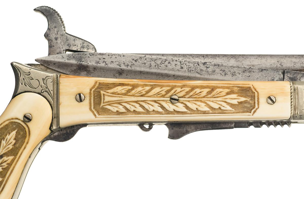 Produced without sights or markings on the spring loaded flip-up barrel, which is controlled by a pushbutton on the left front grip panel, and mounted in parallel to a 3 1/2" dagger point blade with a full length unsharpened false edge. The hammer has a curved, checkered spur, and the sear runs along the underside of the frame to a corkscrew style trigger, which can be manually extended or deployed automatically by cocking the hammer. Alongside the sear and trigger is a retention latch for the blade, fitted with a manual release stud at the rear, and additionally can be activated with a strong pull of the trigger. The working components of the pistol are steel, with ribbed German silver panels at the blade hinge and a leafy scroll engraved German silver grip frame. Fitted with a pair of ivory panels on each side, all with finely carved flora designs and a lanyard mount on the butt.