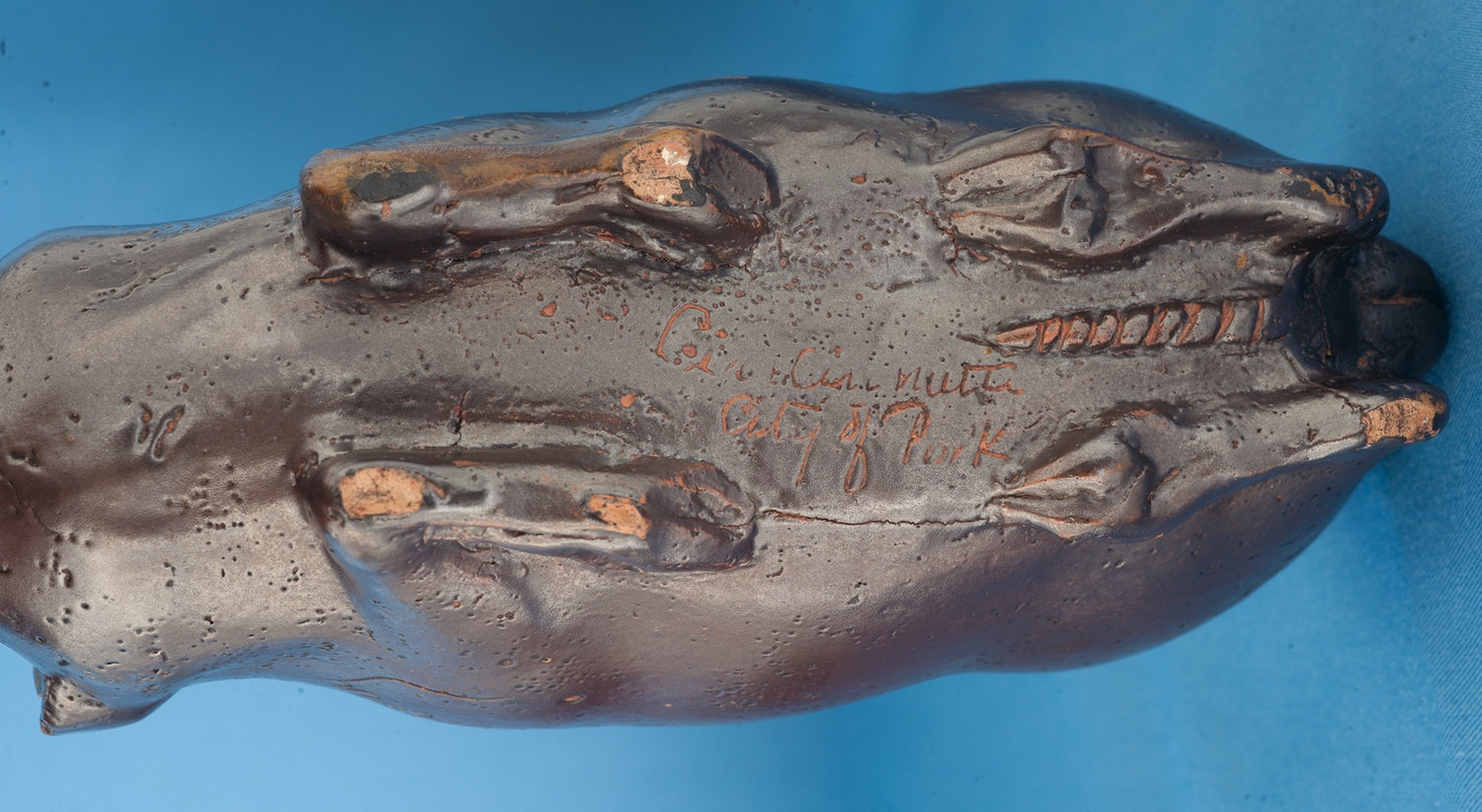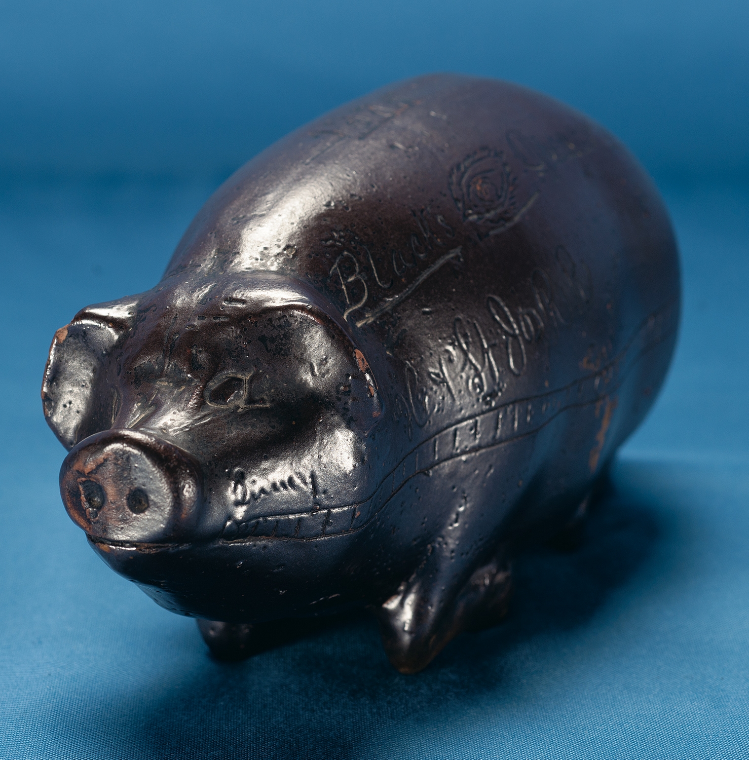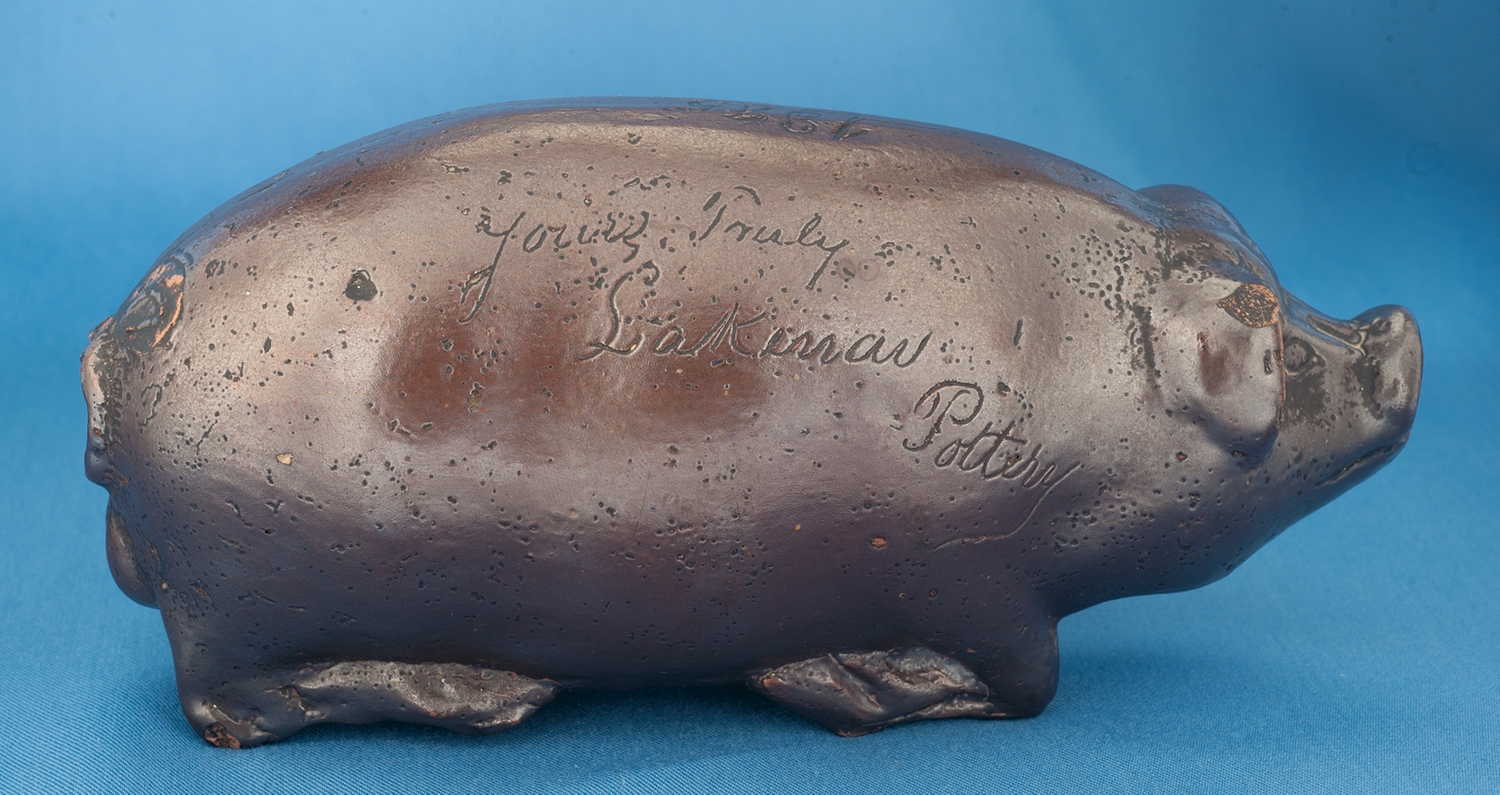 Condition: Very fine, totally original overall. Minor chips on the ears, spout and on the legs that are folded under. Minor glaze popping on the right side below the railroad. Otherwise the pig flask is in great condition. Writer knows of no other example of a Lakenan Potter Pig Flask!