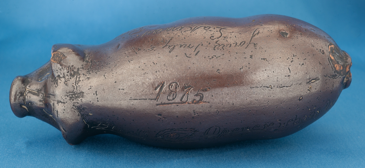 This Lakenan Pottery Pig Flask features an Albany glaze with a mica tint incised at the top is the date "1875" and on the side of the pig "Black's Eye (graphic of an eye) Opener in a hogs value"/H & St. Joes RR/ Railroad track incised from the snout of the pig to the rear with the town of Cameron near the back hind leg, the city of St. Jo near the rear of the pig and the City of Kansas City near the testicles of the pig. The underbelly of the pig is incrised with the "Cincinnati the City of Port". The left side of the pig is incised with Yours Truly/ Lakenan Pottery. It is obvious that Lakenan Pottery inspiration for this piece was the well know and desired pig flasks from Anna Pottery in Anna, Illinois. Lakenan is located approximately 275 miles northwest of Anna, Illinois. Plans for the first railroad to run east to west across the state of Missouri were made in the office of John M. Clemens, father of Samuel (Mark Twain) Clemens, in the spring of 1846, in Hannibal, Missouri. Attorney R. F. Lakenan drew up the charter, "An Act to Incorporate the Hannibal and St. Joseph Railroad Company", which was passed by the Legislature in February, 1847. Hannibal was to be the eastern terminal of the railroad which would run through the county seats of Palmyra, Shelbyville, Bloomington, Linneus, Chillicothe, and Gallatin, then on to St. Joseph. At the time, there was no fast way to travel or transport goods to the western border of the state where much of the pioneer traffic embarked for the northwest. This extremely unique and rare Pig Flask memorialized all of the aforementioned history and expansion of the railroads.