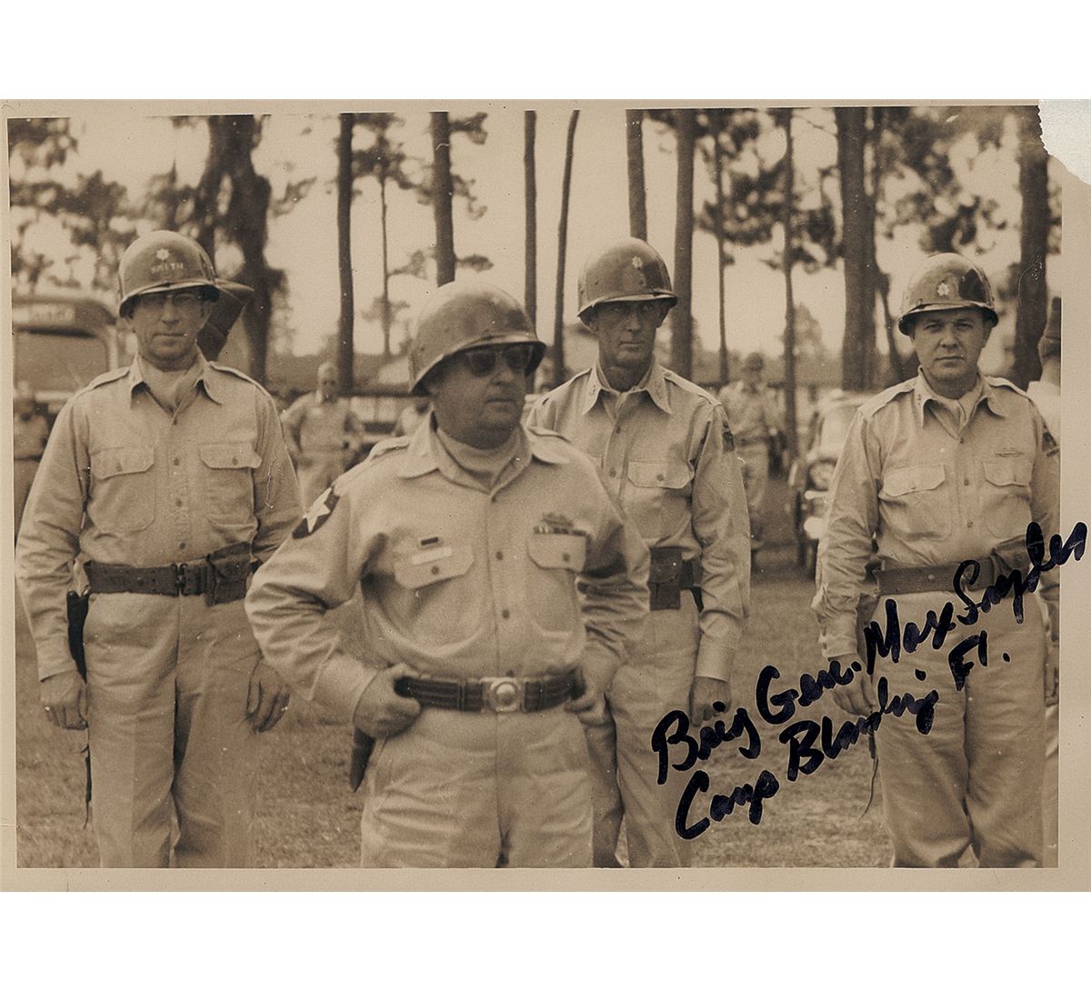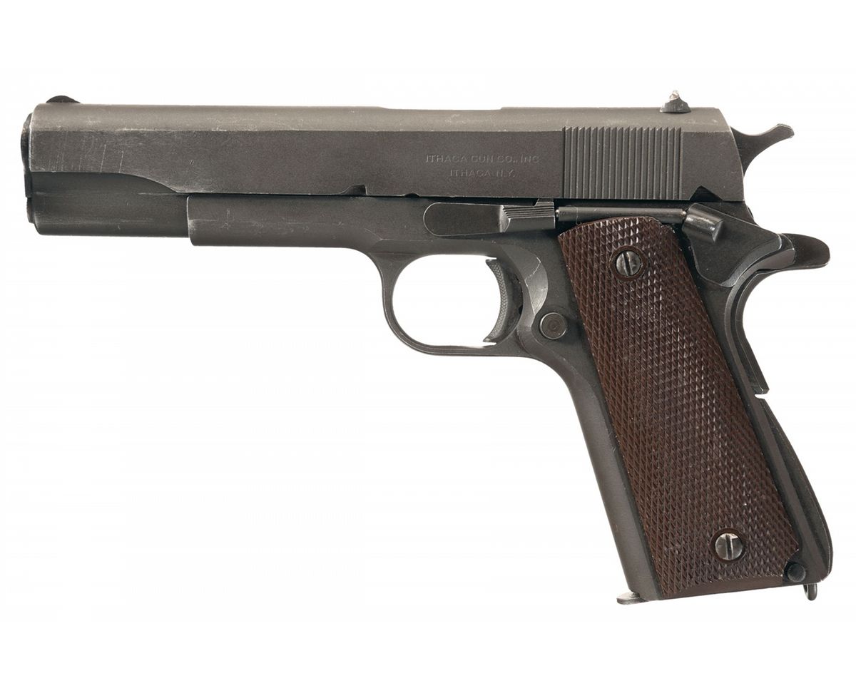 This is an example of a very unique production sample Ithaca Model 1911A1 pistol. The pistol must have been picked up at the factory prior to being serial numbered or government inspected. Another very unique feature about the pistol is that the magazine release button is smooth, it hadn't been checkered yet (writer cannot ever recall seeing this!) The pistol reportedly was the original property of Brigadier General Maxwell C. Snyder. Writer found little other than a photo of the General on the internet. A photo of the General with other officers accompanies the pistol. The left side of the slide has the standard two line address ahead of the serrations and the right side of the frame is marked "UNITED STATES PROPERTY", inverted serial number "4X" ahead of the slide stop hole and "M 1911 A1 U.S. ARMY". Checkered trigger, hammer and thumb safety with a serrated slide stop. Blue unmarked magazine with "MS" scratched into the left side, lanyard loop on the heel and fitted with checkered Keyes Fiber plastic grips.