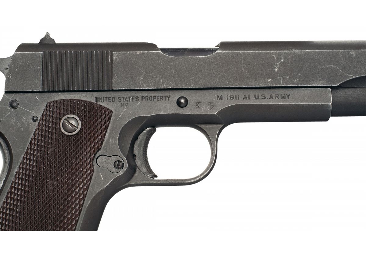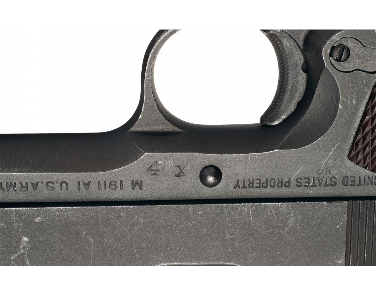 Condition: Excellent. The pistol retains 97% original parkerized finish with some wear on the left side of the slide and high edges with thinning on the grip safety. Overall there are some minor scratches and scuffs. The grips are also excellent with a couple of minor dents and sharp checkering. The markings remain crisp and clear. Mechanically excellent. A very nice unique and rare production sample 1911A1 pistol.