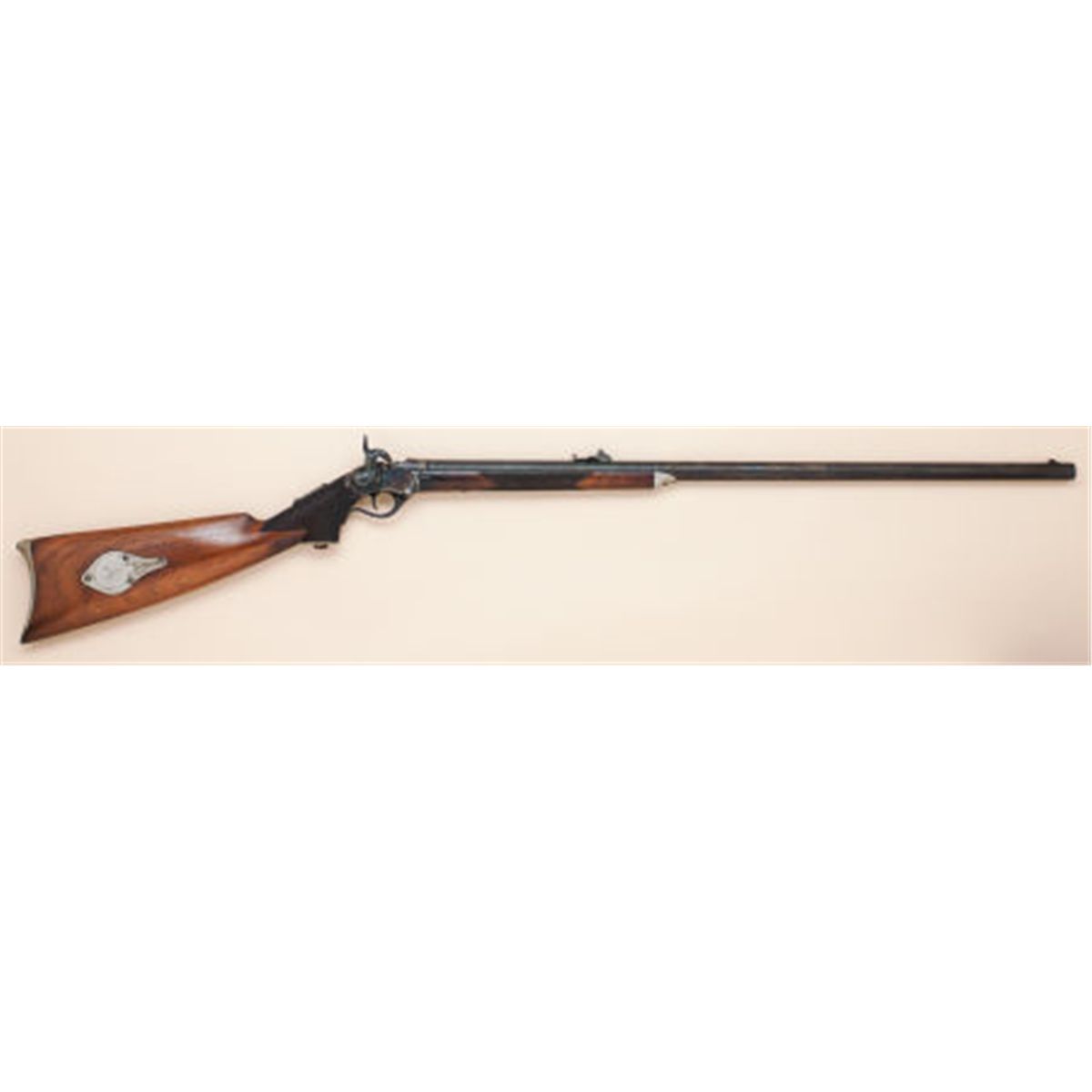 Rare and Unique Sharps Factory Conversion Breechloading Single-Shot Pistol/ Rifle. Serial no. 160, .40 caliber, 27-inch round barrel with a dovetailed front sight and adjustable rear elevation sight. Coined edge band at breech. Case-hardened conversion breechblock with side hammer and lever. Tang-mounted peep sight base with sight not present. Inside left side plate marked: 903/160. Plate marked: C. Sharps & Co. Philada, Pa. Checkered walnut pistol-grip stock and fore-end. Nickel-plated fore-end cap, rear fore-end ferrule, patchbox and buttplate. Oval pistol-grip cap with coined edge and screw finial [see Sharps Firearms by Sellers, page 110]. This example of a factory conversion is the only one of its type that we have seen or cataloged. Condition: Fine. Barrel with mottled gray-brown patina mixed with faded brown finish. Vibrant case-hardening on hammer, frame and breechblock. Wood excellent with light wear and minor marks. Action crisp. Possibly the only Sharps factory conversion rifle in existence and the only one we have examined. A prize for the finest Sharps Collection.