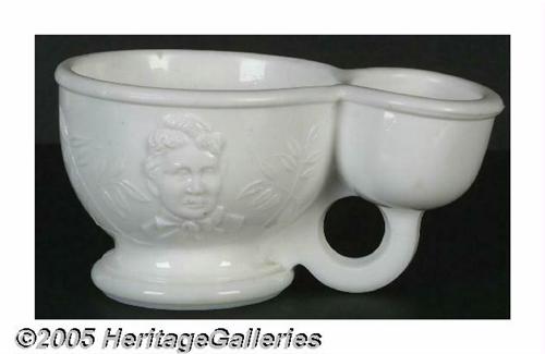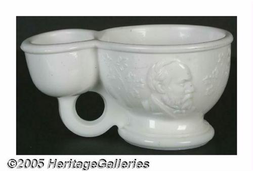 <B>Rare and Unusual Garfield Milkglass Shaving Cup</B></I> In beautiful condition. This particular piece has been offered in clear and blue glass but seldom becomes available in the rare milkglass version. Embossed with the busts of James Garfield and his wife, the cup is approximately 3 inches tall and 5.25 inches across with the addition of the smaller area on the handle for holding a shaving brush. This is a super piece, considered highly collectible by political and glass collectors alike. Lot:259