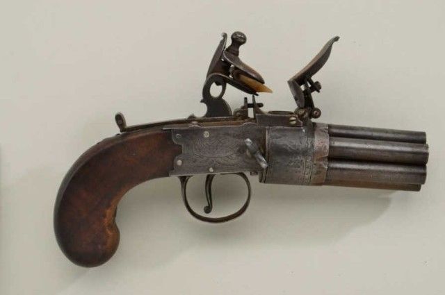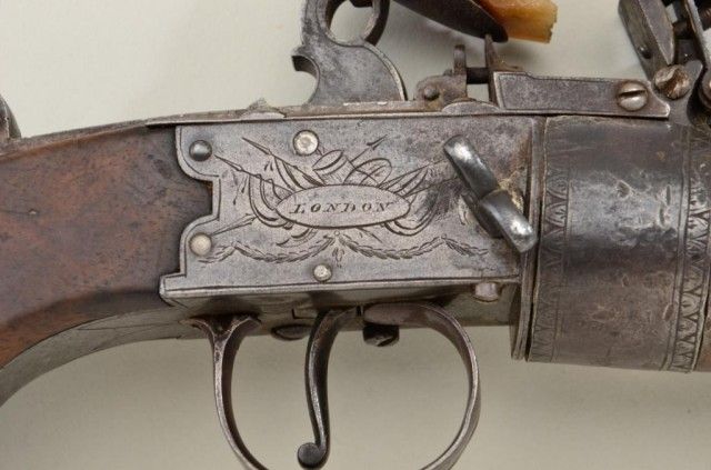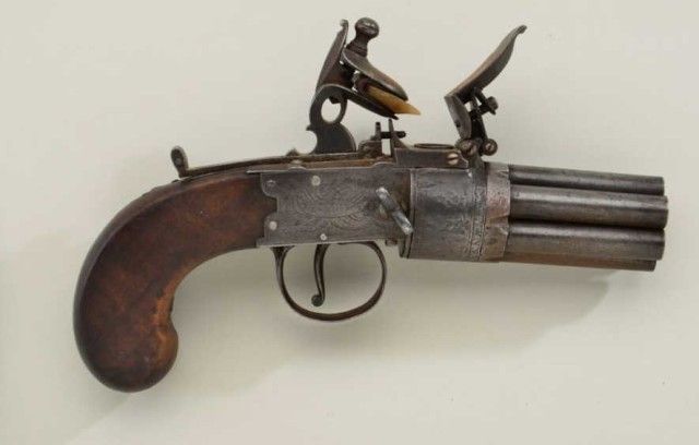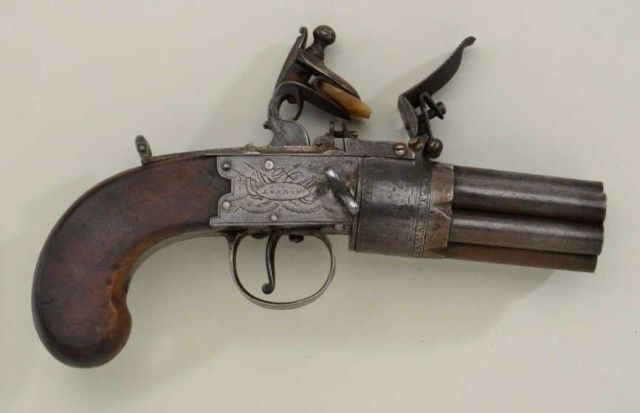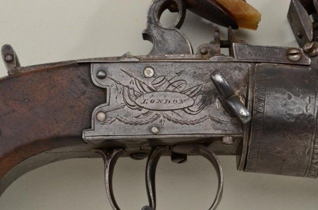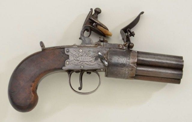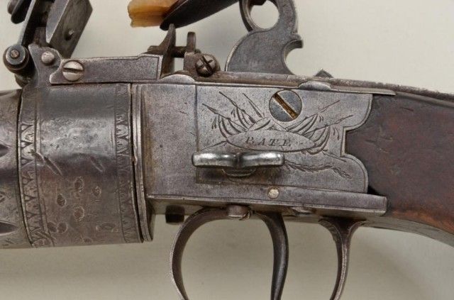Rare and desirable 7 shot Flintlock revolving pepperbox pistol signed “Bate, London” circa early 19th century. The pistol remains in good to very good condition with an unpolished natural patina with sharpengraving and name. The grips are very good, there are some small marks on the barrel and breech. There is a small chip from one end of the frizzen and just normal aging. There is one small piece of wood missing where thegrip meets the frame which is negligible. The barrels are numbered and proofed and the pistol measures 9-1/4” overall with 2-3/4” clustered barrels of approx 36 cal false rifled. A genuine and rare Flintlockpepperbox. From an old N.Y. collector’s estate. Est.;$4,000-$8,000.