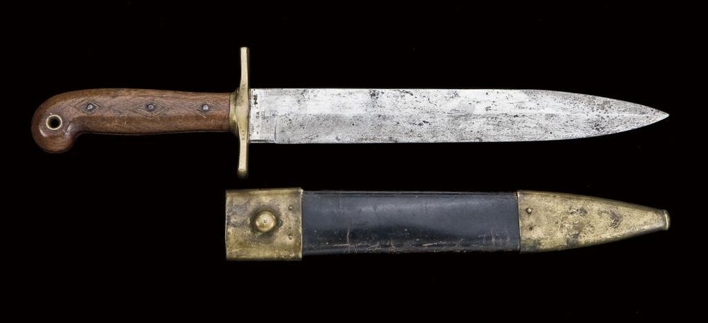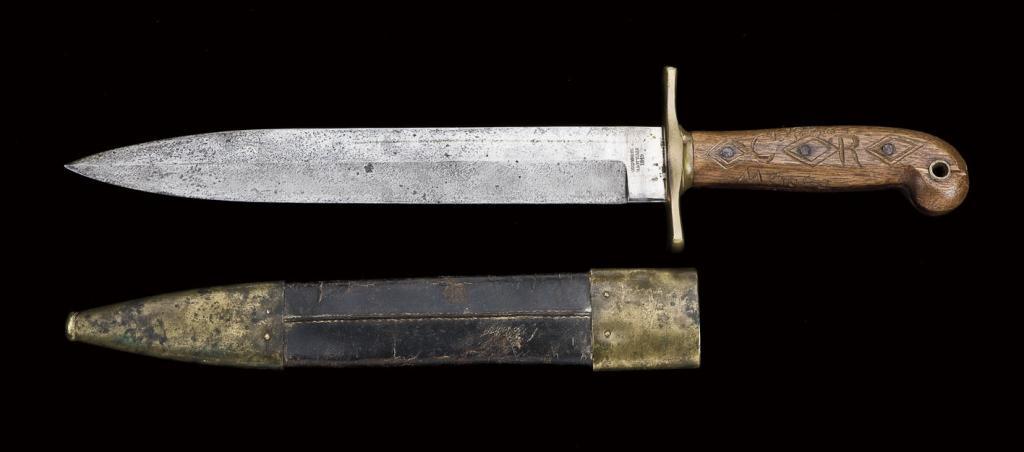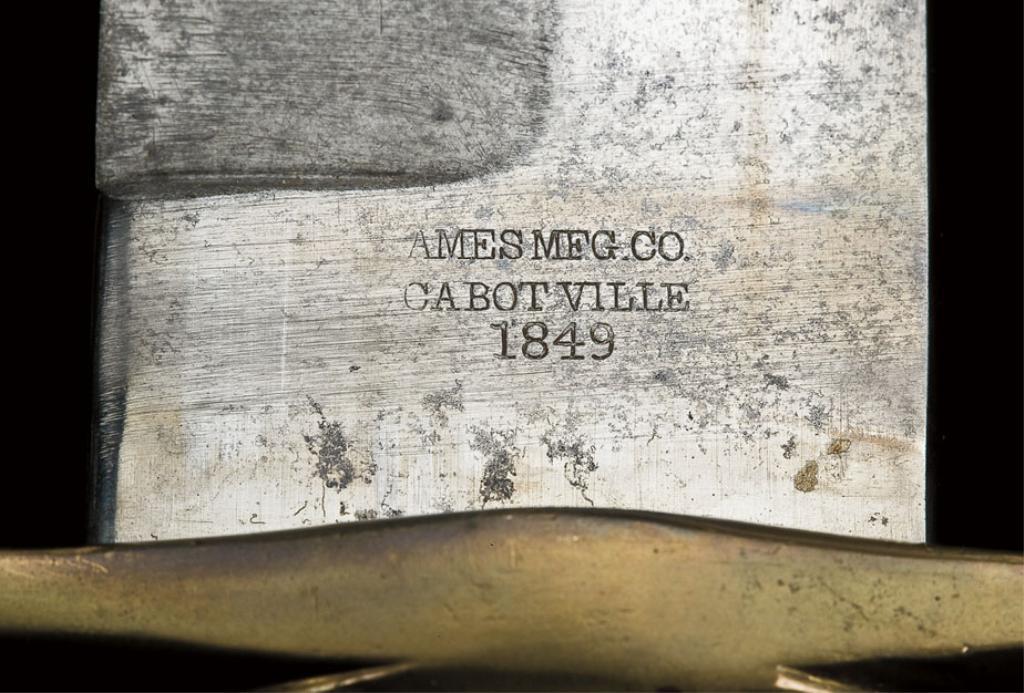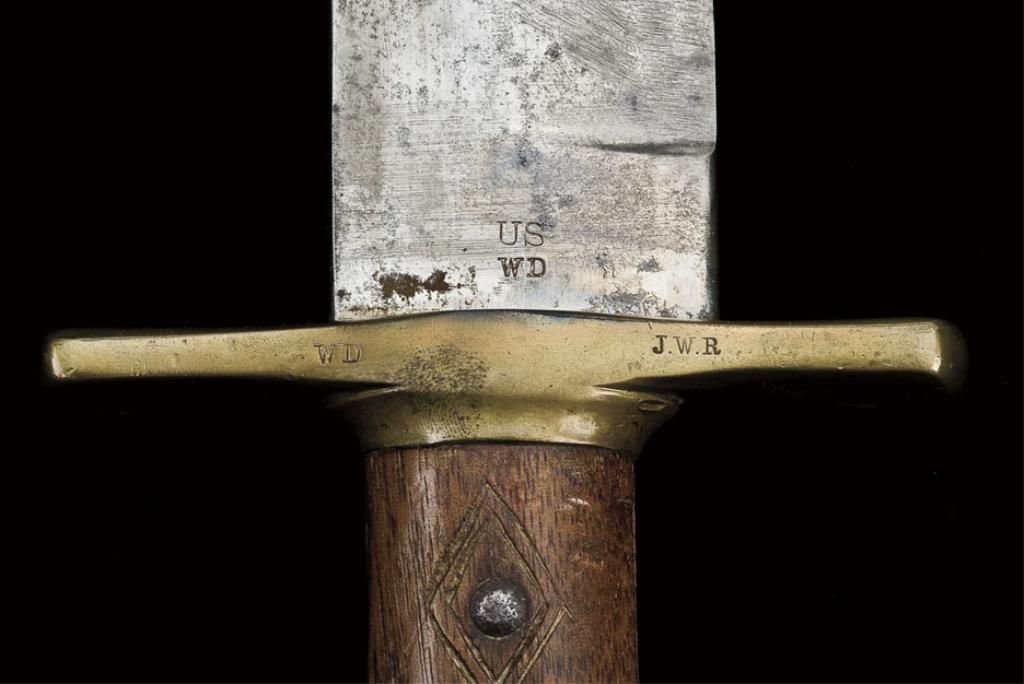 Rare and desirable Ames rifleman’s knife dated 1849. One of approx. 1,000 made, showing full markings and original scabbard. Overall approx. 18”, the blade is 12”. The ricasso is marked “Ames Mfg. Co” and “Cabotville” above “1849” above the ricasso. On the back of the ricasso is marked “US” and the inspectors initials “WD”. The cast brass crossguard with integral ferrule is also inspector stamped with the initials “WD” and “JWR”. The blade is in excellent condition with sharpening marks, good edge, and the blade is slightly tipped. Just some slight discolorations and normal aging. Grip shows excellent condition, and is a walnut with semi birds head hilt and brass lanyard loop in the pommel. Three iron pins secure the hilt. The knife is owner-inscribed with date “1886” initials “CR” and the word “Merced”, with diamond decorations around the pins. The original scabbard remains in very good to near excellent condition with just some slight crazing, with slight patina. The knife and scabbard are completely authentic to the period. The inspector’s initial “D” is on the sheath button. Hugh Hayes Collection. Est.: $7,000-$14,000
