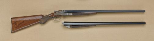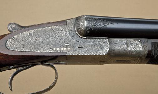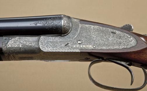 Rare and desirable LC Smith A2 grade two-barrel set in 16ga, single trigger, auto ejectors, serial #211550E. Pictured extensively in Brophy book. The gun shows two 26” sets of barrels serial numbered tomatch, both with matching serial numbers and their own fancy checkered forends matching to buttstock. Barrel #1 is choked approx. Full (right), Improved Modified (left). Barrel #2 is choked Modified (right) and Full (left).Both barrels are marked Sir Joseph Witworth Fluid Compressed Steel, made to order by Hunter Arms, with gold bands on each of the raised non-ventilated ribs. The action is highly engraved in scrolls with smallvignettes of bird dogs on each side of frame, and LC Smith engraved in gold on each lockplate. The fences are deep cut and chiseled in floral designs. The gun remains in fine to near excellent condition, bothbarrels show an excellent factory quality refinish of which 95-98% remains, just slightly aging and toning with some slight losses at the edges and corner. Letters kept sharp and very professionally done. The