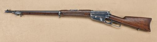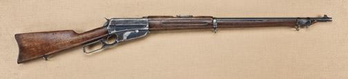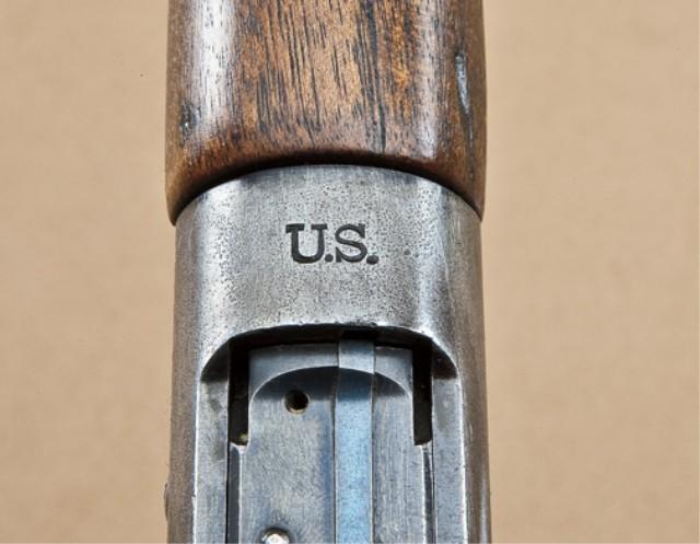 Rare and desirable Winchester model 1895, US marked rifled-musket, .30 caliber, blue finish, cartouched wood stocks, serial #12700. The rifle remains in good to very good condition showing 75-85% blue on exposed portion of barrel, some losses at the edges and muzzle and some minor scratching. The frame shows 40-50% original blue, some scratches, erosion, and areas of just-starting pinprick pitting. This buttstock shows a good cartouche just above the lever on the left side of the wrist, and rack numbered “49” and “70” in the belly of the stock. Along with an “M” type inspector’s mark, with three sling-swivels present, and sling swivel eyelet at front of frame. The lever shows a KSM inspection, the frame shows a large “U.S.” stamp. Buttplate is also KSM inspected as is the bolt and several other small parts. The forend shows a few minor chips at the action, a couple of slight cracks, some small losses around the upper edge. The buttstock shows the initials “DN” carved in, but generally good to very good overall with good markings, good action, very good bore. Very difficult US Martial long-arm to obtain, particularly with a cartouche. Est: $4,000 -