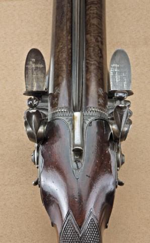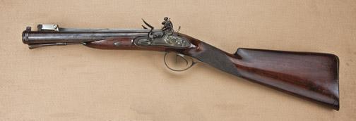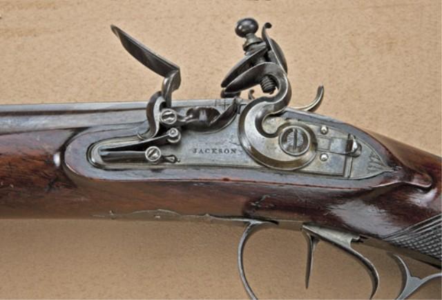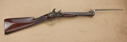 Rare and desirable double-barrel flintlock blunderbuss with center-mounted spring bayonet, iron cannon barrels, signed Jackson, circa approx. 1790-1820. The gun measures approx. 27” overall with 11-7/8” barrels of each showing approx. 7/8” bore and are nicely ringed at the muzzles for a canon-barrel type effect. The barrels show 50-70% original tobacco brown damascene pattern finish with some erosion and light pitting at the edges, normal aging. The locks show traces of silvery grey case hardening and are fully original with correct hammers, top jaws, screws, small parts. The stock is very good plus with crisp checkering at the wrist, some minor dings, mars, scratches, light overcoating of schalack or spray varnish, no sanding, great wood to metal fit. Generally very good overall with original to the period horn-tipped ramrod which is proper for this gun. The spring bayonet is working and locking and there is some very bright original finish on the top rib beneath the bayonet. Double-barrel blunderbuss’ are very scarce and desirable, and particularly hard to find with original bayonets. Provenance, Chris Anderson, Ft. Carson antiques who, at the time he sold a great number of British