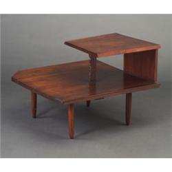 Rare and early GEORGE NAKASHIMA walnut corner table, 1954, with chip-corner square plank top and raised free-edge shelf, on tapering dowel legs. (Consigned by original owner.) Unmarked. 26 3/4" x 35 1/4" x 26" $8,000 - 10,000