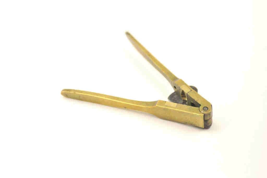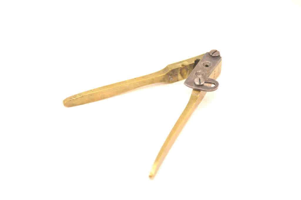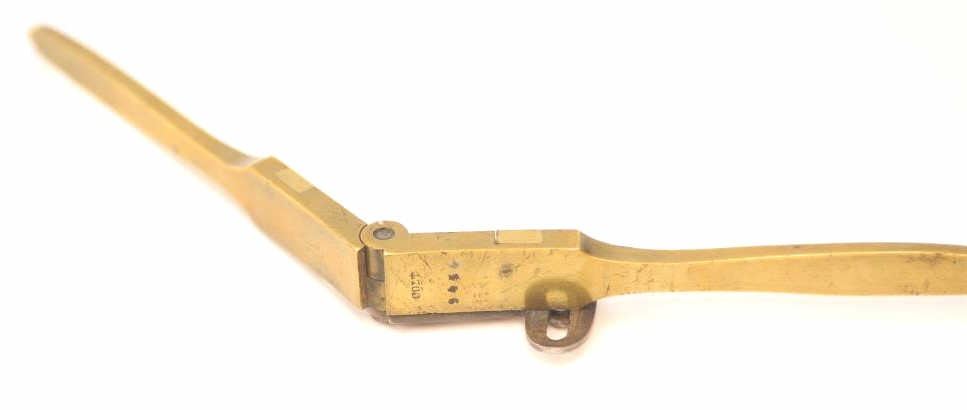 Rare and possibly unique .31 caliber Colt marked brass mold numbered 945. Blued sprue cutter with brass body and legs measuring approximately 5 3/8” from the tip to end. Round and conical ball with 2 grease grooves. Very good plus condition. Minor dings and mars. 75% bright blue on sprue cutter with minor erosion. Good cavities. We have not seen another example in 50 years of selling percussion collector’s Colts. Est.:$500-$1000