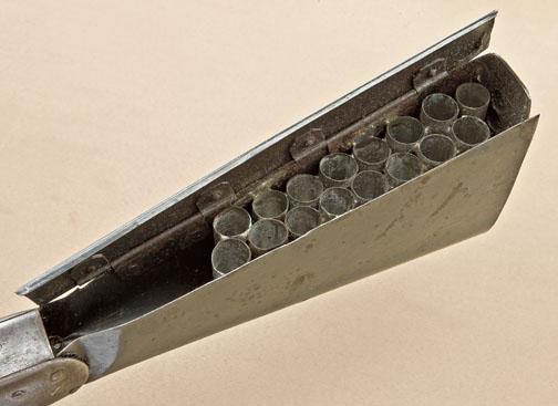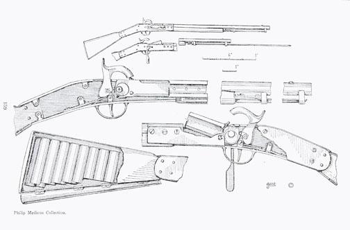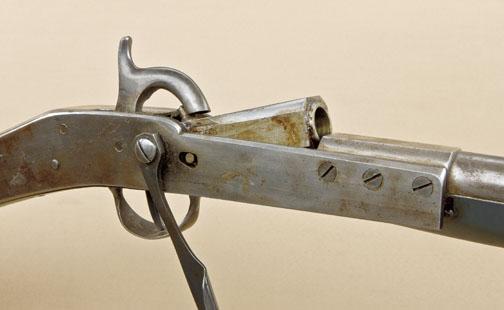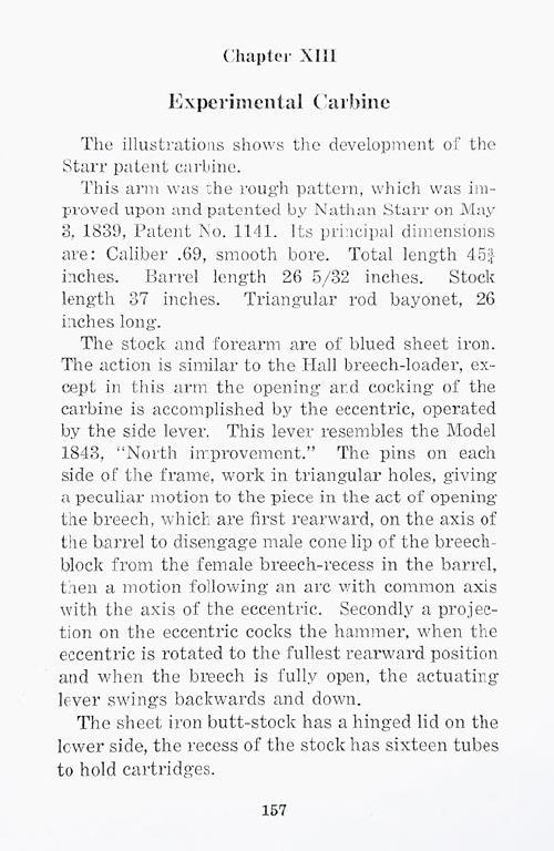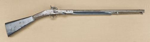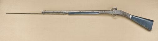 Rare and unique Nathan Starr improvement to Hall rifle, patent or prototype model and only specimen known. Approx. .69 caliber smoothbore, 29” barrel, with triangular bayonet mounted beneath barrel, sheet metalblued stocks with compartment for paper cartridges in butt. The gun is in near fine condition showing bright finish, some minor rust and erosion, and just beginning surface-type rust, but shows colors onhammer, crisp metal surfaces and no use whatsoever, just darkening from storage and absolutely no cleaning. The forend and buttstock show a blued finish of which most remains. Refer: Nathan Starr, U.S. Sword andArms maker by Maj. James Hicks, page 158, where the patent papers are pictured and a notation states that it is interesting that it was four years before Simeon North suggested his improvement to the ordinancedepartment. A museum quality rarity that most sophisticated martial collectors could not even identify. Est: $7,500 - $15,000+++