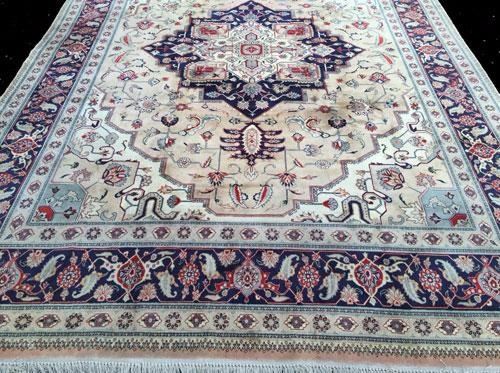 Rare and unusual color fine Persian-Pak Heriz-Serapi rug. 100% natural, vegetable dye, hand woven, baby lamb's wool pile on cotton foundation. Heriz rugs are known and valued for their artistic and colorful character. These rugs have their own very unique style and therefore are distinguishable from other styles. Where majority of Heriz-Serapi have red or rust background, this unusual piece has a rare and sought after light color background. Also, Heriz-Serapi in general have a coarse weave, however this lovely piece has an extremely fine weave. This captivating piece is masterfully hand woven, knot by knot, and has about 160 knots per square inch. It would take over three years to weave and create this piece. Size: 12 feet X 9 feet. Country of Origin: Pakistan.