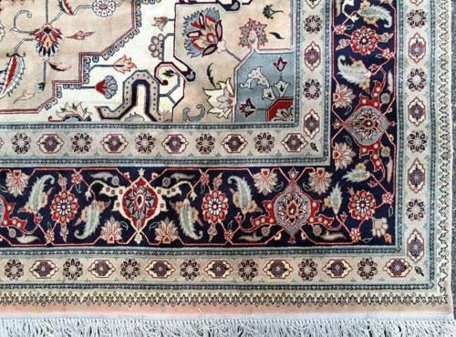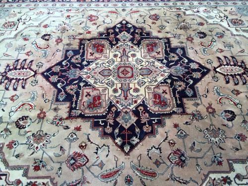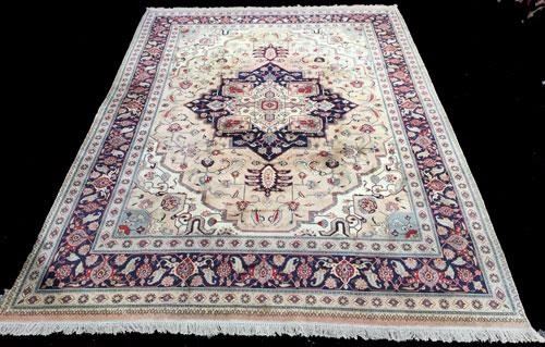 Rare and unusual color fine Persian-Pak Heriz-Serapi rug. 100% natural, vegetable dye, hand woven, baby lamb's wool pile on cotton foundation. Heriz rugs are known and valued for their artistic and colorful character. These rugs have their own very unique style and therefore are distinguishable from other styles. Where majority of Heriz-Serapi have red or rust background, this unusual piece has a rare and sought after light color background. Also, Heriz-Serapi in general have a coarse weave, however this lovely piece has an extremely fine weave. This captivating piece is masterfully hand woven, knot by knot, and has about 160 knots per square inch. It would take over three years to weave and create this piece. Size: 12 feet X 9 feet. Country of Origin: Pakistan.