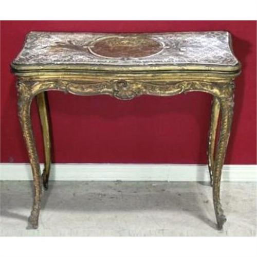 Antique Rococo style Italian table.Florence ,circa 1850.It opens up and become a game table.35" wide, 17" deep and 30" high. When open the table dimensions are 35" wide, 34" deep and 30" high.It is greatly carved and gilt on all four sizes so it can be use as table, console,center table and game table.It has very rare beautiful carved gilt and paint decorated top. Wear to gilding.Overall in good condition