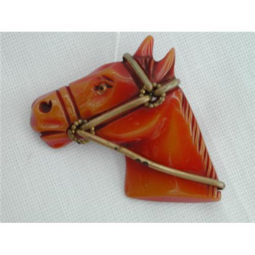 </font></strong>Rare bakelite horse head brooch /pin. Fine lage golden/amber-rust color horsehead with metal reins and jewel like bakelite eyes of a different color.