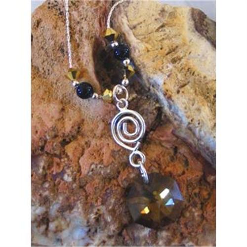 This new creation of mine is a real stunner! A most fantastic new swarovski pendant called teak! Beautiful in person.<p> This hangs from a silver plate spiral connector. Free floating on this nice little sterling silver snake chain, is 4mm 24k coating, gold aurum 2x color swarovski crystals, 2mm sterling silver rounds and 4mm genuine black jade beads.<p> What a stunning look for the holidays or anytime, goes great with almost any color you choose from casual to fancy! dress up, dress down, this piece goes anywhere! I added a nice little sterling silver lobster claw clasp. necklace measures 18 in. pendant hangs about 1 1/2 inches<p>