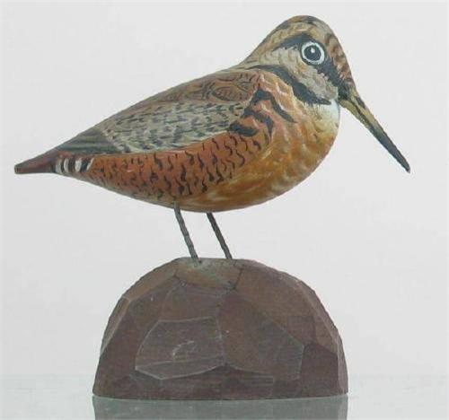 Rare early miniature woodcock on an unusual dimple carved wooden base by A. E. Crowell, East Harwich, MA. Great detailed paint. The rectangular brand is on the bottom of the base. (decoy)