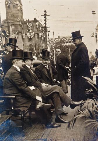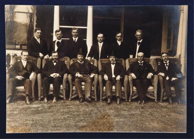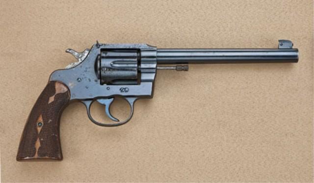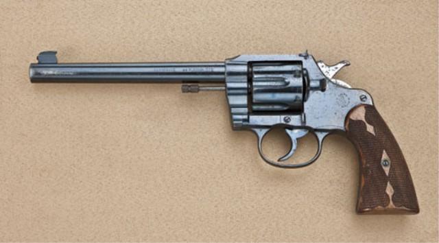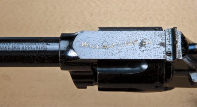 Rare factory gold inlaid Colt New Service Target model revolver, .44 Russian caliber, 7-1/2” barrel, Flat-top frame, diamond sights, diamond checkered wood grips, serial #18491. Letter states factory engraved, the name William Loeb is inlaid in gold on top of frame, charged to advertising account, shipped to William Loeb Jr. August 3rd, 1907, one gun in shipment. The pistol remains in very good to near fine original condition showing 75-85% original bright blue, some flaking at the back of frame and muzzle. A small amount of use, near perfect action, very good plus to near fine grips with sharp checkering, a couple of minor bruises, and some light erosion and pinprick pitting, starting where the finish has lifted. The action is tight, the interior excellent. The top of the frame inlaid in flush gold block letters in a flowing design like a wave. The only factory gold inlaid New Service Target a collector will probably have the opportunity to obtain, with a very important factory presentation to Roosevelt’s right-hand-man who was empowered to speak for the President and reporters were instructed to contact him 24 hours a day. The gun was shipped to Loeb while he served under President Roosevelt