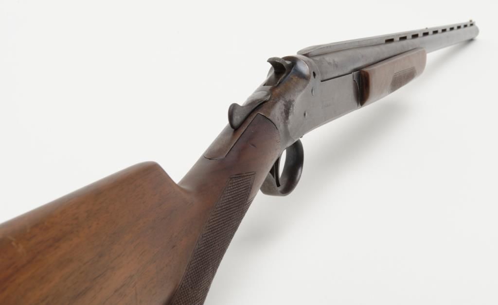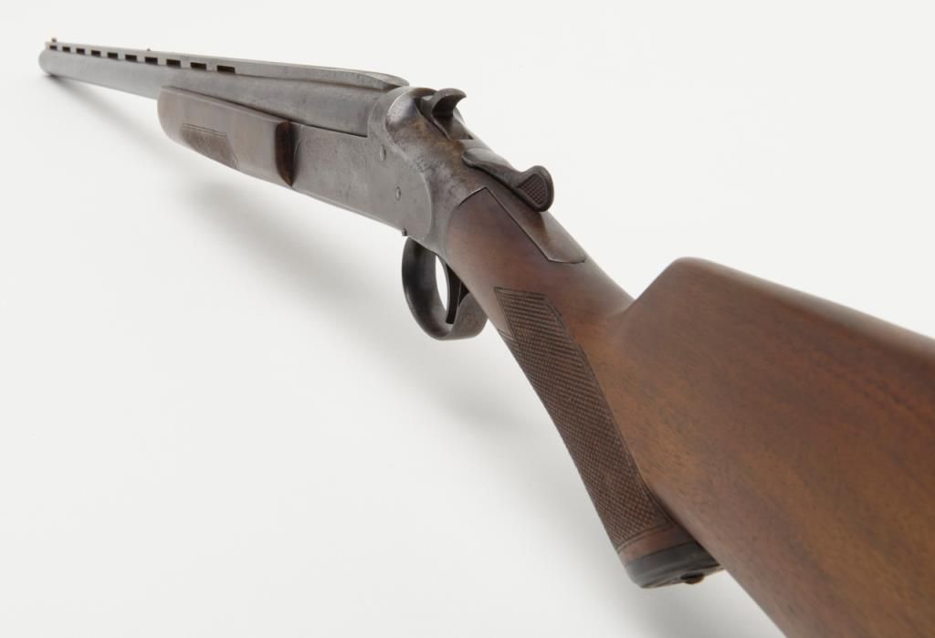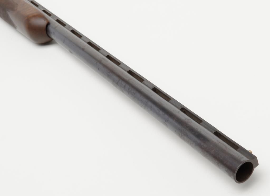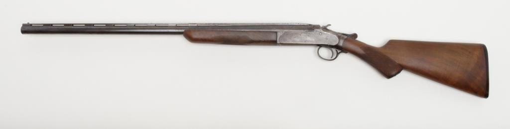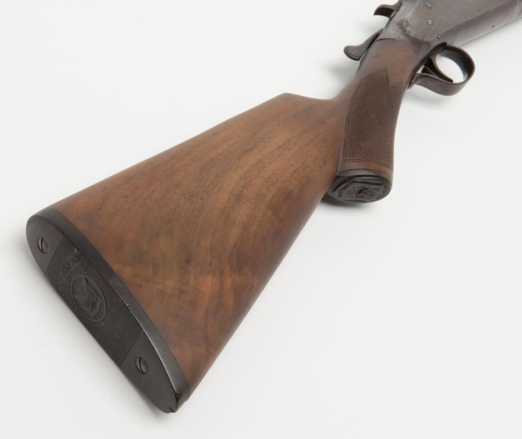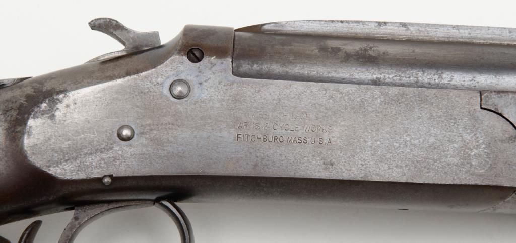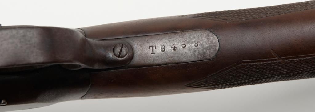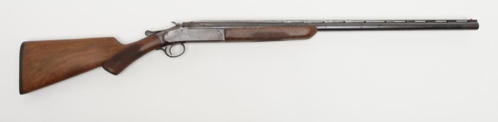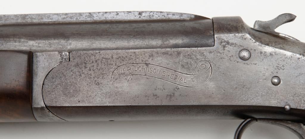 Rare factory original Iver-Johnson Special top break single shot shotgun, 12 gauge, 28” VENTILATED rib barrel, blue finish, checkered wood stocks, #T8438 in overall very good condition showing considerable scattered original blue onbarrel with brown patina and spots of erosion, brown patina on receiver with some erosion and original blue in protected areas; very good + bore, crisp action, good markings and very good wood stocks showing correct owl’s head hard rubber butt plate. (C&R). Est.: $250-$500