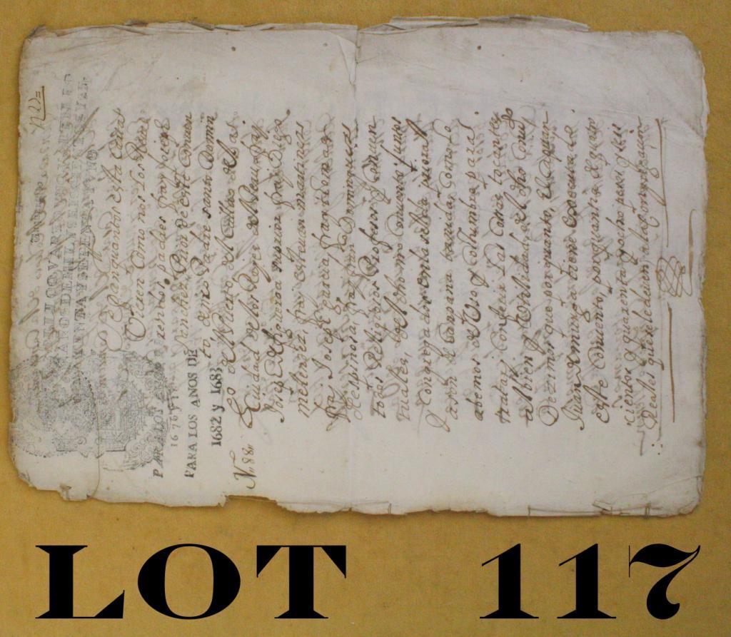 Rare five page hand written Spanish Colonial legal document regarding a Convent in Peru in overall good condition for its age with folding, some staining and tattering to edges but overall very readable (in Spanish)withofficial seals dated 1682 and 1683. Est.: $200-$400.