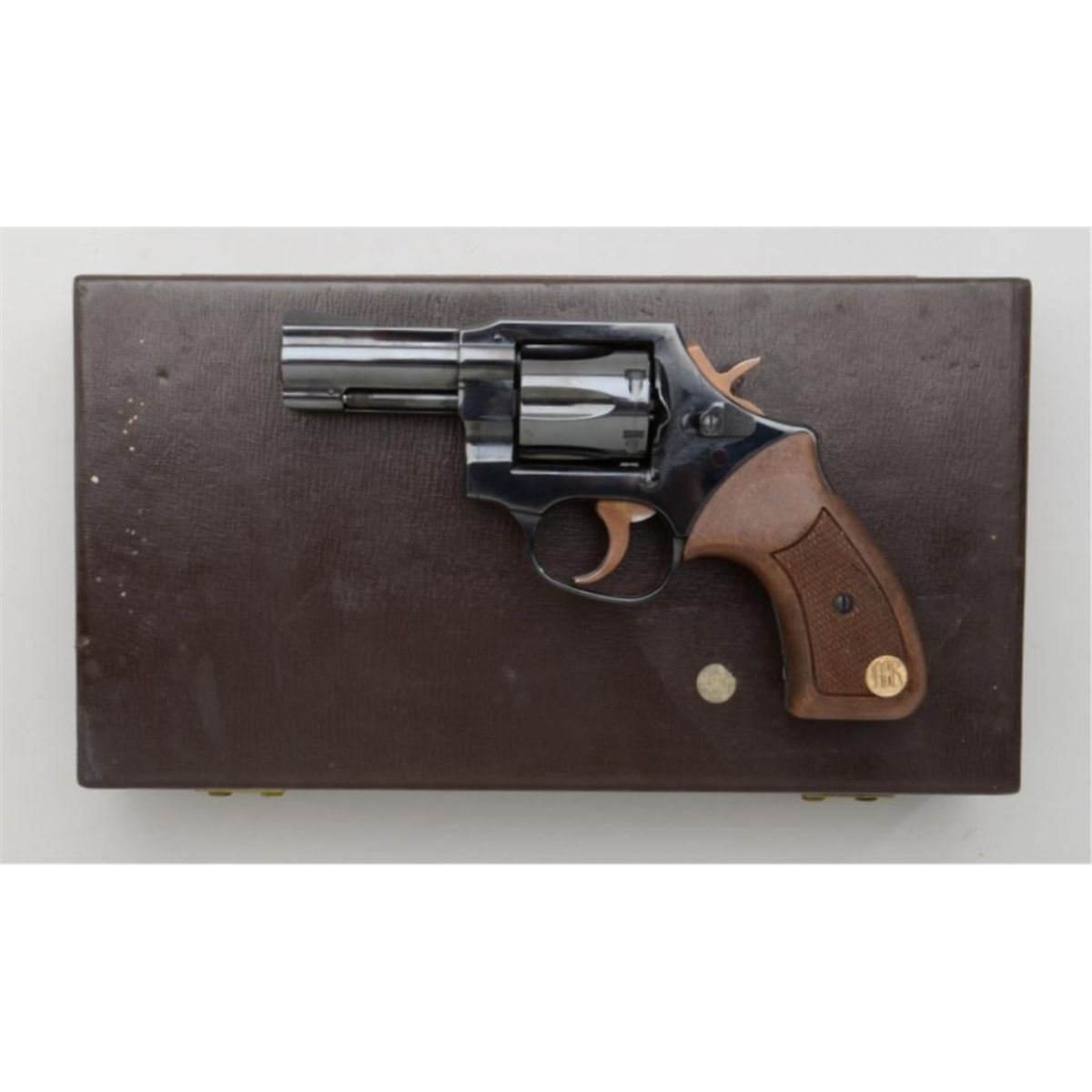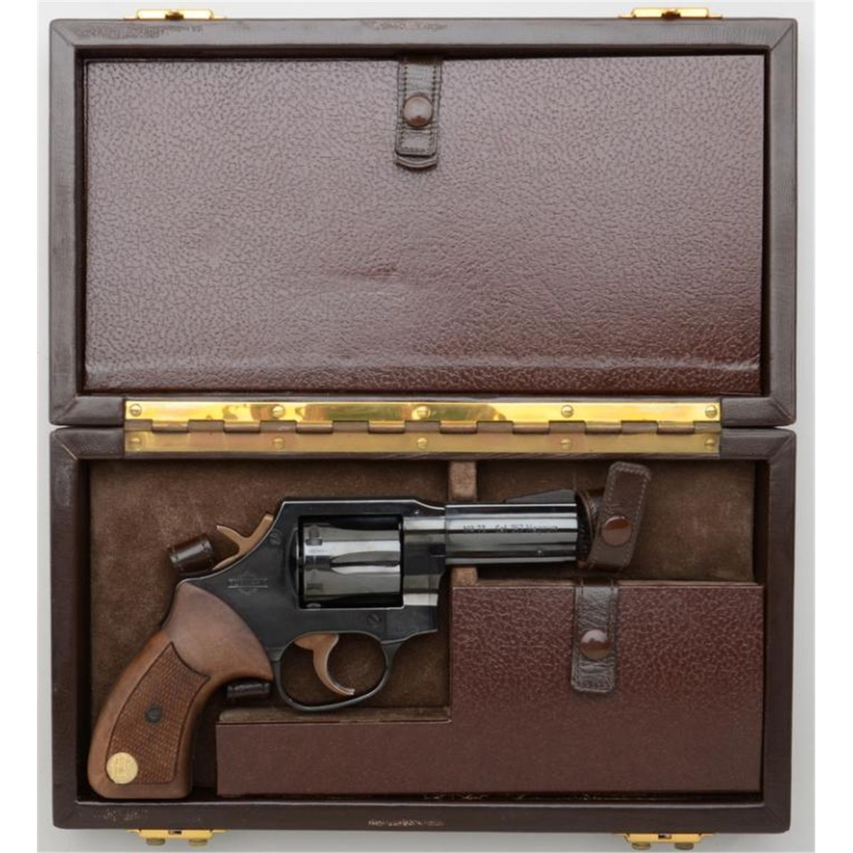 Rare great quality deluxe cased Manurin DA revolver, similar to the German Korth and the only example we have seen, .357 Magnum cal., 3” barrel, blue finish, checkered medallion wood grips, #B2284. This gun is in overalllike new condition showing little handling or use, fine lined leather covered display case with instructions and cleaning kit. Est.: $400-$800.