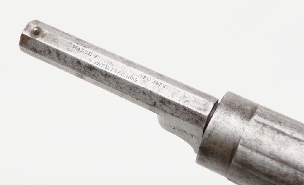 Rare iron frame Walsh, 10 shot double hammer pistol made for superimposed loads and manufactured by New Haven Arms Company when Oliver Winchester was president and major stockholder concurrent to the production of Henry rifles.Refer Flayderman 7A – 117.5. This Walsh is contained within its original to the period partition style velveteen lined case. The pistol shows a light gray patina finish with traces of original finish mixed in. The barrel address isgood and the grips are good to very good with most of their original varnish and just some slight edge wear with minor marks. The action and triggers are working. The interior of the case is good to very good with some small tatters,impressions and normal aging. The compartment for the flask was slightly enlarged for a Colt type Eagle flask which appears to have been in this compartment during working life. A brass Colt mold is also in the adjoining compartment along withcaps and lead balls. The exterior of the case shows some nicks, mars and scratches but is at least good to very good. Walsh pistols were recently featured on the cover of the Winchester Collectors Association magazine and they are