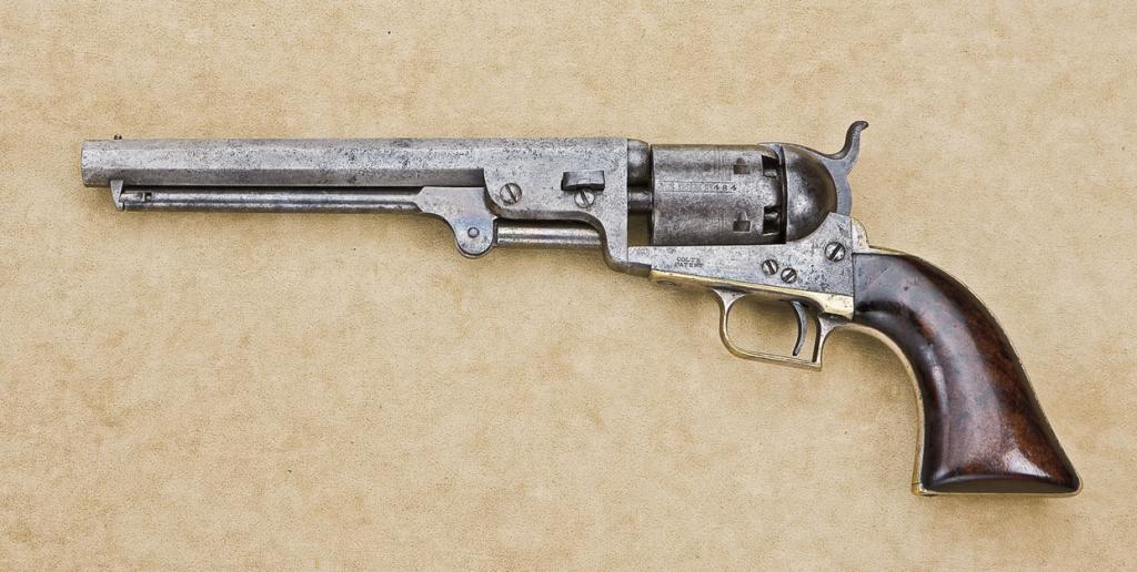 Rare original Colt first model Navy revolver with wedge-over-screw variation, .36 caliber variation, grey patina finish, varnish wood grips, serial number “484”. The revolver remains in original good to very good condition showing scattered light to moderate surface pitting with some areas of slightly heavier pitting in a few small areas. The cylinder shows 20-30% original scene going light. There is traces of original case hardening going silver on frame and lever. The backstrap and triggerguard show 20-30% heavy original silver plate, mostly drifting on backstrap. The varnish wood grips are good showing even wear and oiling. Small repair and slight refinishing with linseed oil. The top of the backstrap is scratched with a reversed initial “V” in the silver plate, which is very light and without a doubt the original owner’s identification mark. The barrel address and Colt’s patent markings are sharp. The Colt’s patent marking on cylinder is mostly visible. All matching serial numbers except loading lever (number “284”). Action is crisp, interior exceptionally good. Experts estimate between 600 and 800 of this early Navy were produced as the serial numbers were concurrent with early second models. This was the best wedge-over-screw variation DuPont could obtain with over 50 years of searching. With inventory sheet, obtained by noted firearms dealer David Comdon, 1991. Est: $7,000 - $14,000