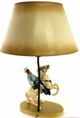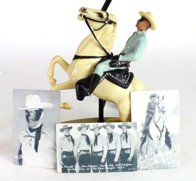 Mfg'd by the Heartland Company with only 4 different type including the Lone Ranger, Roy Rogers, Annie Oakley and Matt Dillion. Lamp remains in excellent original condition, no repairs, figure stands 10 1/2" tall on it's original blonde base, overall 22" to top of shade. Original cord intact, lights nicely and includes 3 original photo cards from penny arcade machine purchased by the owner in 1949, photo cards show Lee Powell as the Lone Ranger and a group shot of Powell and members of the cast. Terrific collectible from a time frame when Cowboys were heros to young kids. Est. 400-750