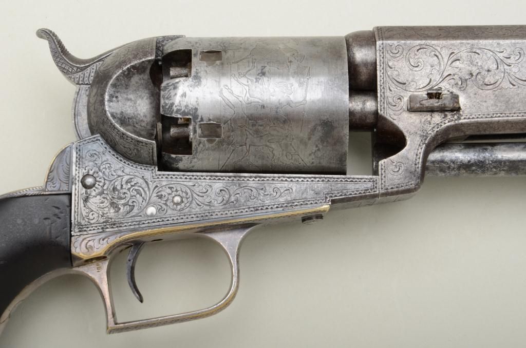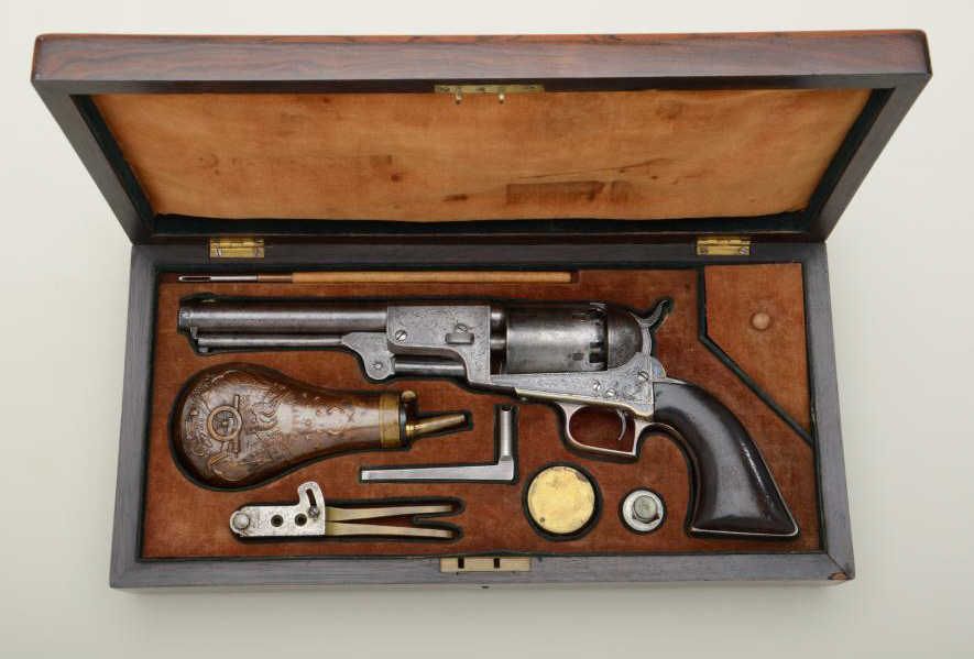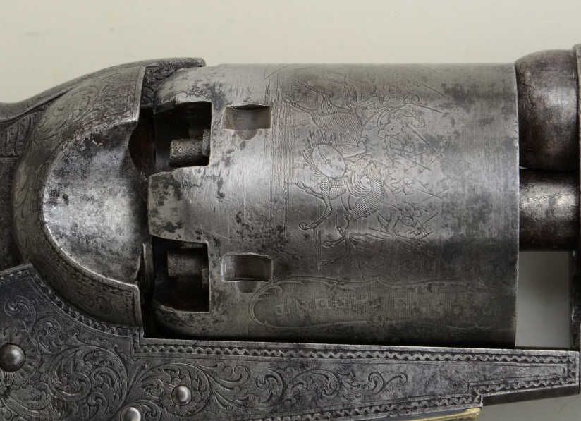 Rare original Vine scroll engraved Colt Second Model Dragoon, .44 cal. percussion, traces of original finish, French style cased in rosewood box with accessories, serial #8487. One of only a few of engraved SecondModels in the Vine scroll known; other engraved specimens are numbers 8478 and 9625, which are a similar pattern and estimates of less than 6 still existing. This Colt was discovered in Texas in the 1950s and waspictured in the "Texas Gun Collectors" magazine, which we were unable to locate at time of cataloging. The Dragoon shows a light gray to brown patina finish with strong traces of finish mixed, scattered light tomoderate erosion and surface pitting, and a couple areas of slightly heavier pitting that are the size of a thumbprint. The cylinder shows 50-70% cylinder scene, with well defined characters and Model USMR and Coltspatent lightly visible. The grips are good with traces of varnish, some even wear from carry and use. The backstrap and trigger guard show 75-80% darkened original silver plate. The barrel address and markings are