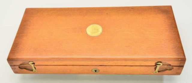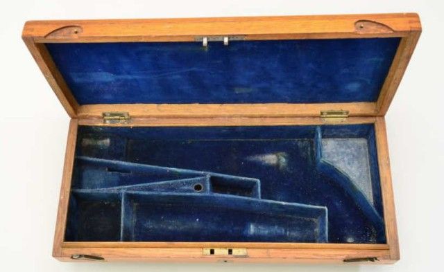 Rare original case for Colt London Dragoon showing partition style interior lined in blue velveteen and brass mounted oak exterior. The interior is in good to very good condition and would clean nicely justminor normal aging and some dirt. Shows some wear at contact points but would accept nice dragoon with up to a 75% finish and accent it nicely. The compartment cover for right upper corner is missing. The exterior showsits brass hooks and both plates. The exterior of the case is very good plus with just normal aging. A rare and original Colt accessory that could double the value of your gun. Est.; $4,000-$8,000.