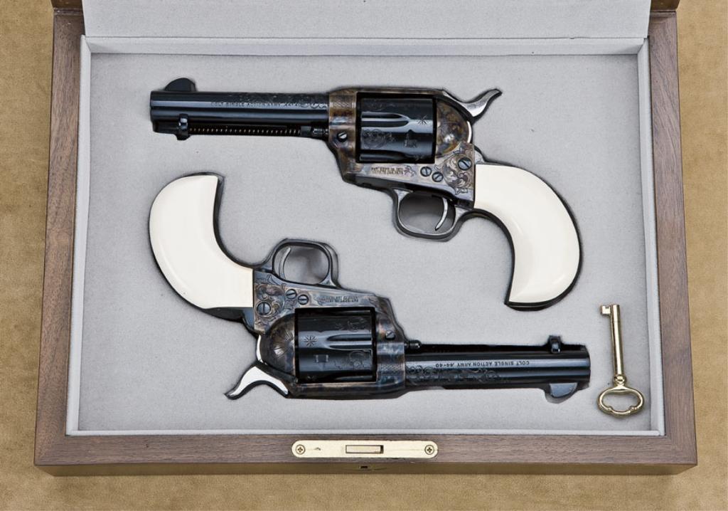 Rare pair of factory-engraved Colt Single Action Army revolvers, .44-40 caliber, 4-3/4” barrels, royal blue and case hardened finish, factory bird’s head shaped grip with mounted with ivory in French style Colt case. Consecutive serial numbers “SA93032” and “SA93033”. The pair are excellent to mint condition and show no evidence of firing and are 99.9 to 100%. Original Colt casing also excellent. Factory letter states “B engraved by master engraver Dennis Kies. Shipped to Bangers Distributors, Birmingham, Alabama” Factory order number “3631”, and letter confirms features. Less than a dozen bird-head gripped Single Actions were factory engraved. Est: $7,000 - $14,000