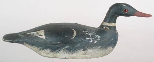 Rare solid body, red breasted merganser drake decoy by Luther Nickerson, Cotuit, MA in the typical Cape Cod carved wing style. In XOP with Minor t/u to 4 or 5 painted feathers in front of the wings by Nickerson. Glass eyes, struck by a few shot, neck filler cracked and a small area of wood missing over the dowel on the back of the head. Tight check in the neck can be fixed easily. HBN brand on the bottom. Rare example of a drake by this maker. Luther believed in making almost all hen merganser and whistler decoys with only an occasional drake as he felt that the multiplicity of hens would be best to lure in the prefered drakes. (decoy)