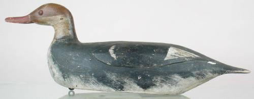Rare solid body, red breasted merganser hen decoy by Luther Nickerson, Cotuit, MA in the typical Cape Cod style. Mostly OP with minor in use t/u by Nickerson. Painted tack eyes, struck by a few shot, Neck seam visible with some filler added on the front of the neck. HBN brand on the bottom. Rare example by this maker. (decoy)