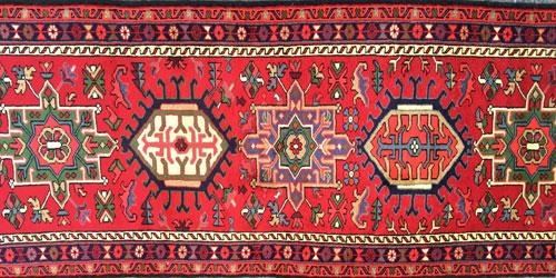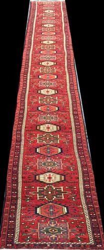 Rare unique size and spectacular long Persian Heriz Runner. 100%natural, vegetable dye, hand woven, highest quality baby lamb's wool pile on cotton foundation. This is the most beautiful example of bold geometric and colorful Heriz-Serapi design of multiple medallions on a heartwarming red color background. Please note that it is extremely rare to come across a long 38 foot Heriz runner in the market place. The superior quality of the baby lamb's wool pile has such a glowing character that makes this a captivating piece at first glance. Heriz is a town located in northwestern Iran. Heriz rugs are known and valued for their artistic and colorful character. These rugs have their own very unique style and therefore are distinguishable from other styles. Though Heriz rugs do not have high knot counts, one should be mindful that Heriz weave is very well packed and usually comes with a thick pile. this is a charming example of a Heriz rug. Size: 38 feet X 2 feet 10 inches. Country of origin: Iran.