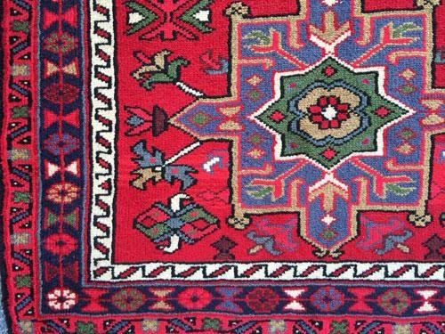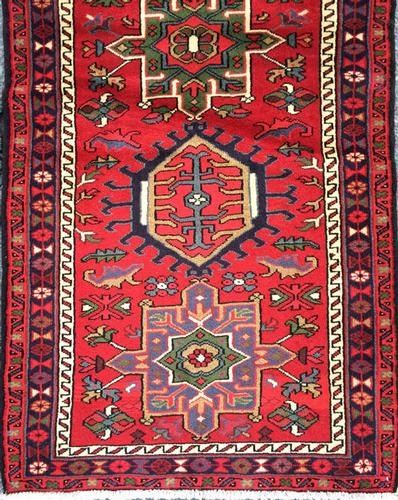 Rare unique size and spectacular long Persian Heriz Runner. 100%natural, vegetable dye, hand woven, highest quality baby lamb's wool pile on cotton foundation. This is the most beautiful example of bold geometric and colorful Heriz-Serapi design of multiple medallions on a heartwarming red color background. Please note that it is extremely rare to come across a long 38 foot Heriz runner in the market place. The superior quality of the baby lamb's wool pile has such a glowing character that makes this a captivating piece at first glance. Heriz is a town located in northwestern Iran. Heriz rugs are known and valued for their artistic and colorful character. These rugs have their own very unique style and therefore are distinguishable from other styles. Though Heriz rugs do not have high knot counts, one should be mindful that Heriz weave is very well packed and usually comes with a thick pile. this is a charming example of a Heriz rug. Size: 38 feet X 2 feet 10 inches. Country of origin: Iran.