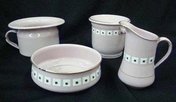 Seldom seen child's enamel set in the rare pink shade. 95% original paint. Some paint loss here and there. Pieces generally are 4" tall or in diameter.
