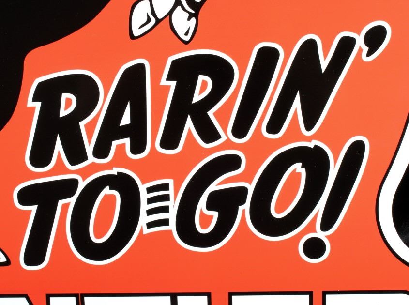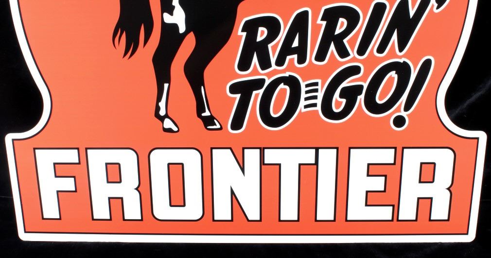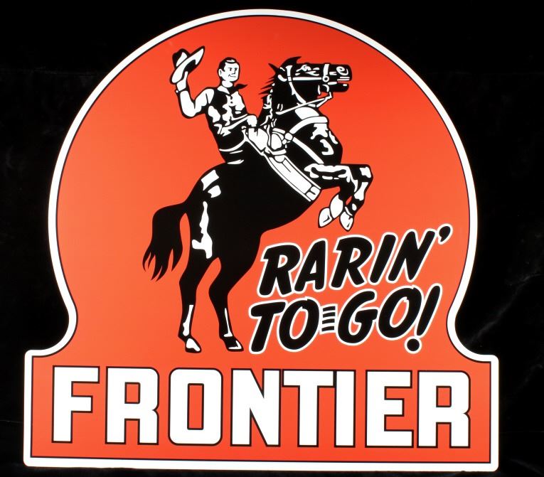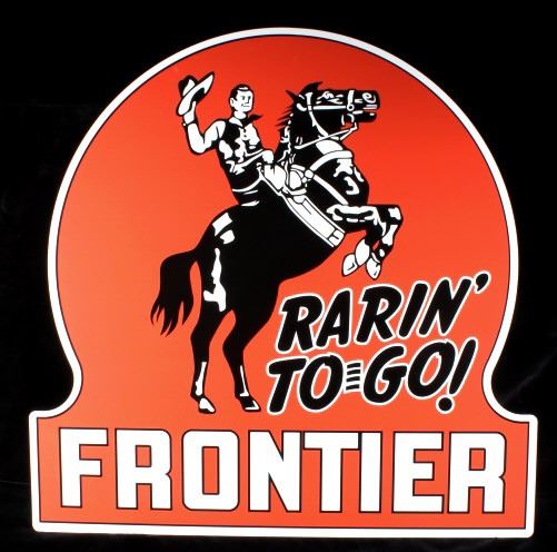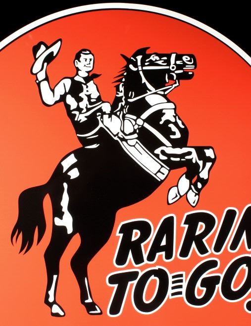 Featured in this lot we have a large Rarin' to-go Frontier one sided advertising sign. The sign is constructed out of tin, with applied graphic. The sign shows a red background with the image of a Cowboy on a rearing horse. The sign reads "Rarin' To Go - Frontier" across the bottom of the piece. This modern sign is in good condition overall with no signs of wear or damage. The piece measures 35 1/2" wide by 35" tall.
