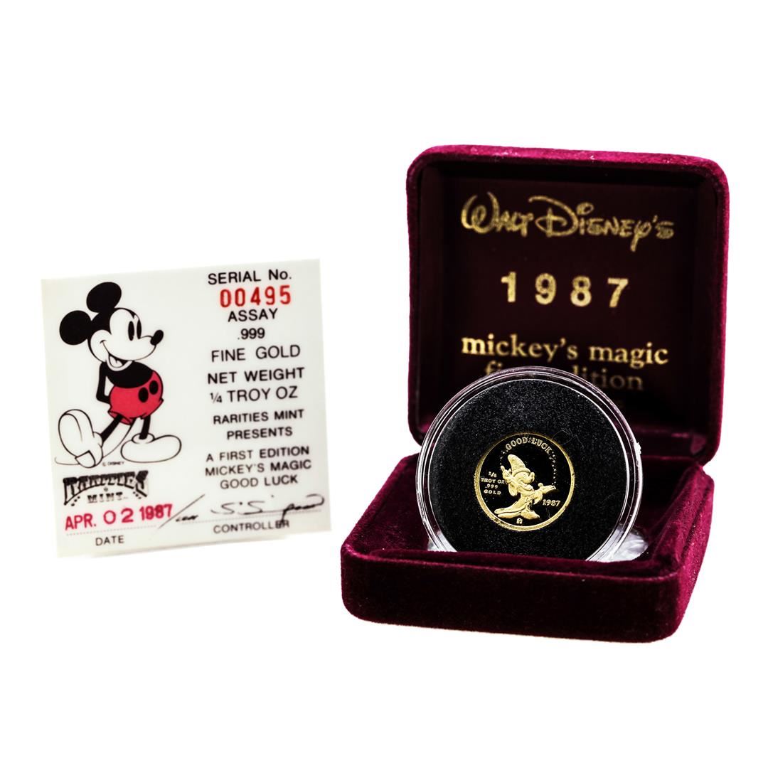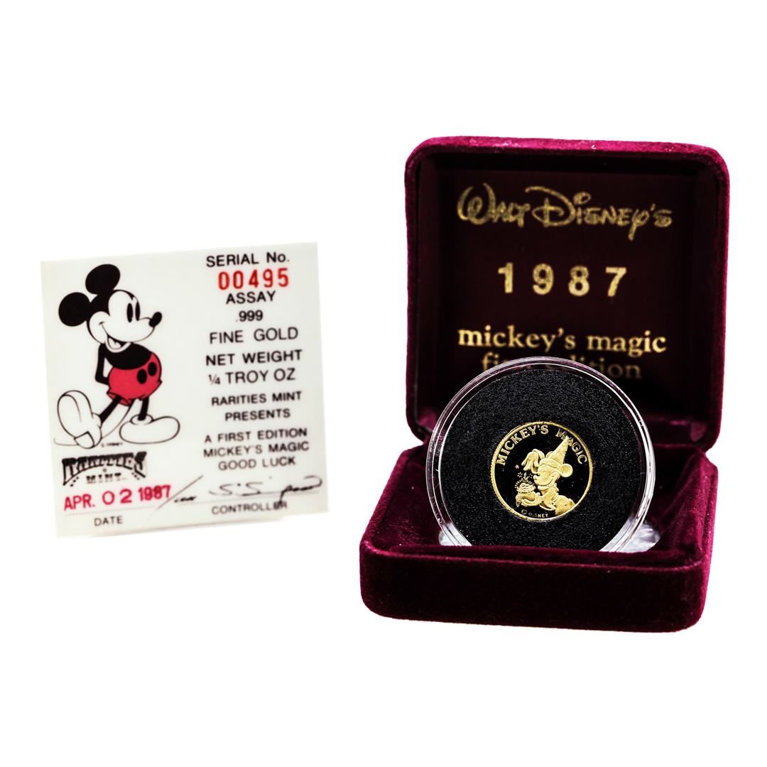One Rarities Mint 1987 Disney Mickey's Magic 1/4oz Gold Coin with Box and COA.