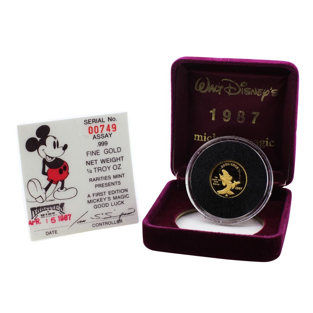 One Rarities Mint 1987 Mickey's Magic Good Luck 1/4 oz Gold Round with Box & COA.