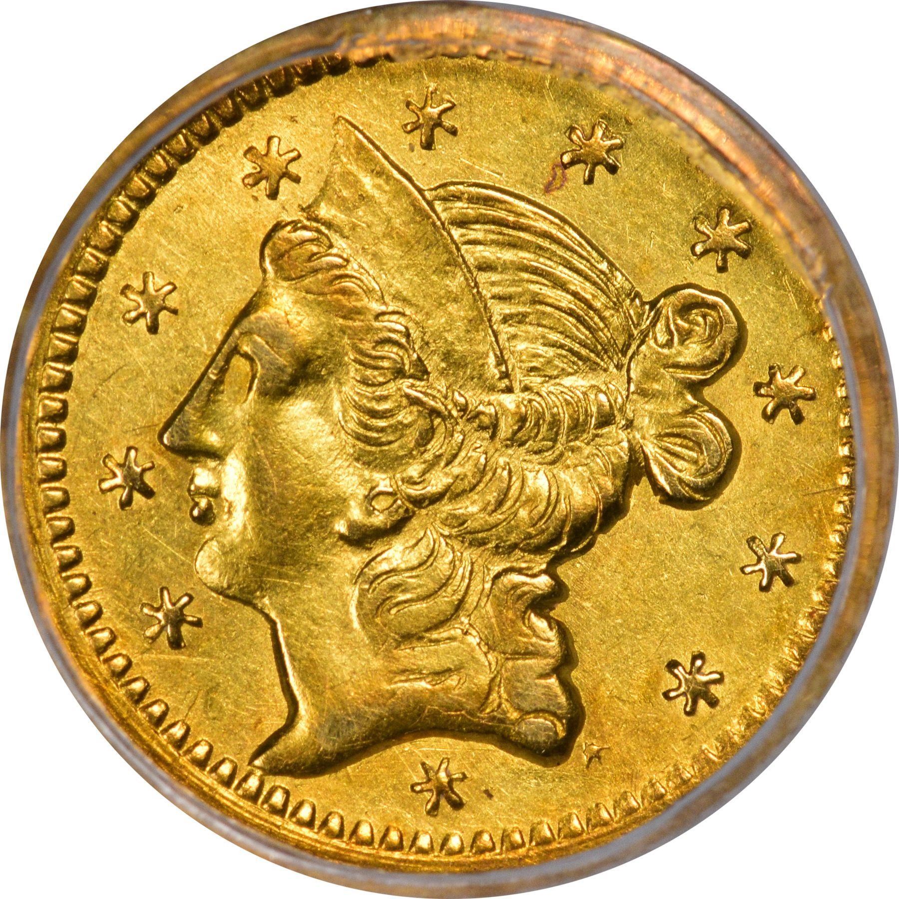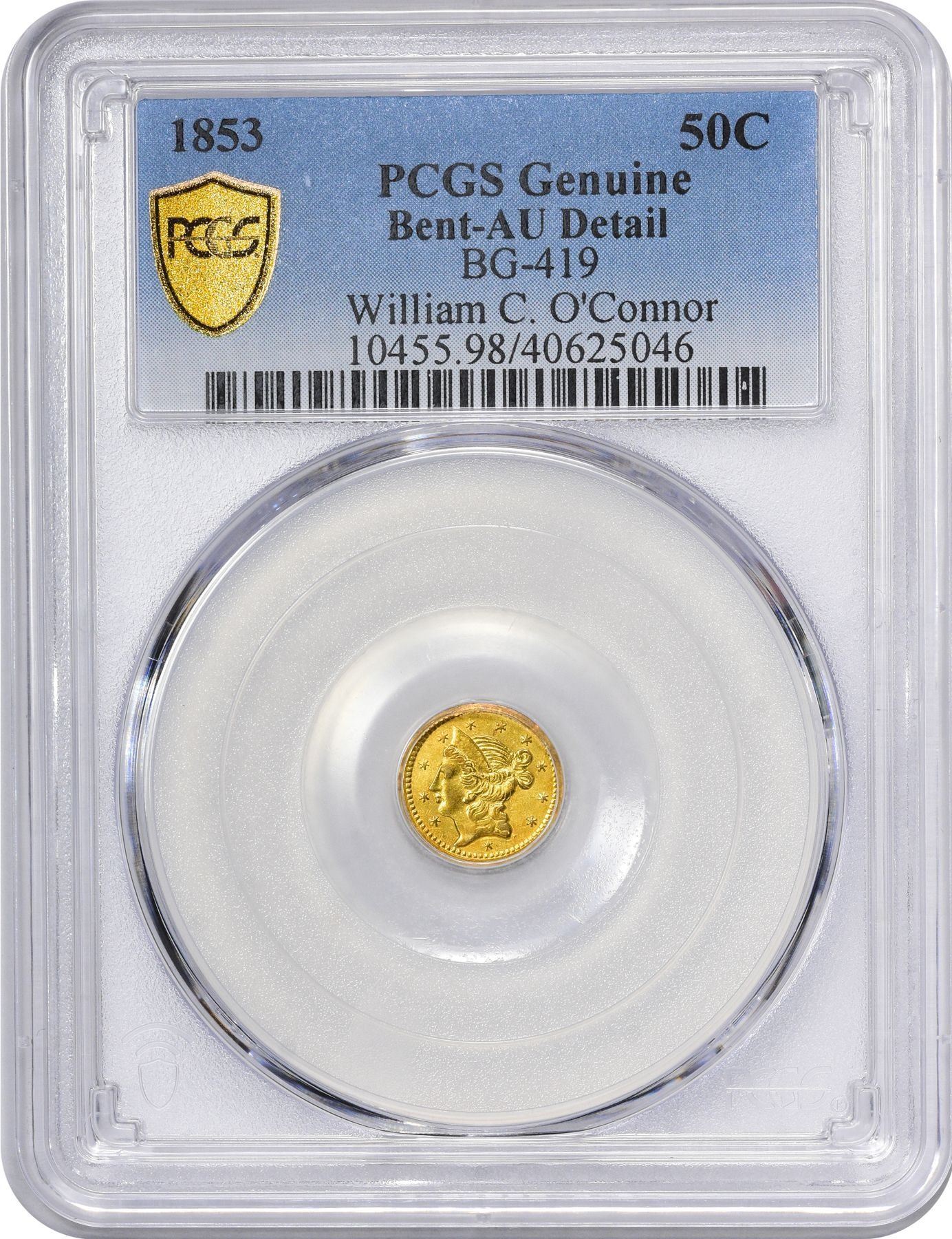 Description: 1853 round Half D, BG-419. PCGS Genuine Bent – AU Detail. “Rarity 8.” Similar obverse, lower head, bust point touching border, 1st star near chin; same reverse die. The last unsigned Deriberpie issue. Brilliant yellow gold color, very minor planchet warping (have seen worse ignored). PCGS Genuine Bent – AU Detail William C. O’Connor (PCGS# 10455).