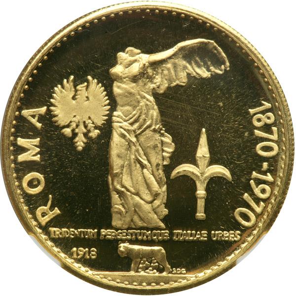 Ras al Khaima. 100 Riyals, 1970. Fr-3; KM-23. Weight 0.5989 ounce. Nike of Samorthrake. Italian Unification. NGC graded Proof 67 Ultra Cameo.