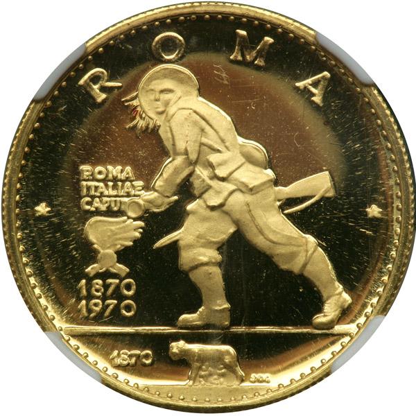 Ras al Khaima. 75 Riyals, 1970. Fr-3a; KM-22. Weight 0.4494 ounce. Soldier at the Porta Pia. Italian Unification. NGC graded Proof 67 Cameo.