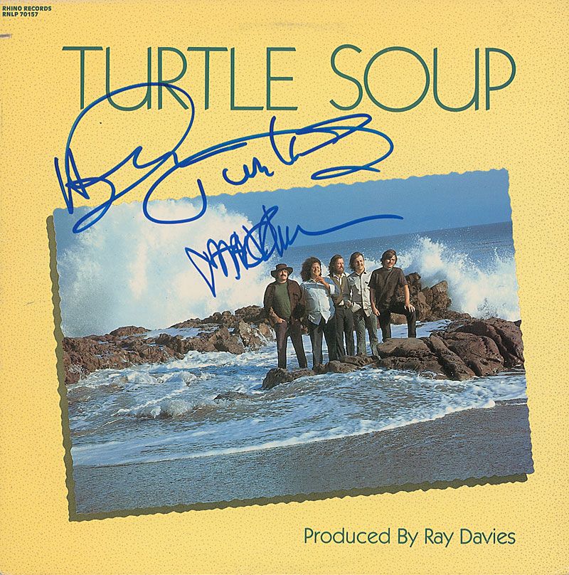 Two albums: Turtle Soup, signed on the front cover in blue felt tip by Mark Volman and Howard Kaylan; and Time Peace, signed on the front cover in blue felt tip by Felix Cavaliere. Light creases and general rubbing wear, and a discount cut to the Turtle Soup album, otherwise overall fine condition. The records are included.