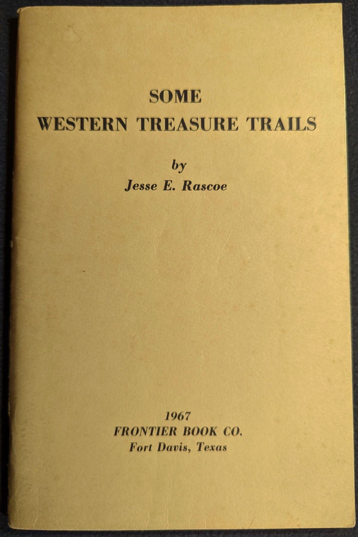 Rascoe, Jesse Ed. SOME WESTERN TREASURE TRAILS. Frontier Book Company. 1967. 12mo. 80 pages. Fort Davis. reprint edition. original tan printed card covers. map. Fine. This book is a collection of tales of treasure hoards and lost mines as reported from contemporary newspaper accounts. The accounts come from the following states: Arizona, California, Colorado, Nevada, New Mexico, Texas. Lot weight: 0 lbs 5oz. Subject(s): Buried Treasure.